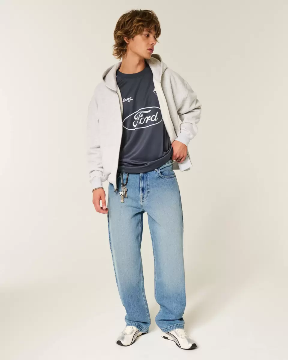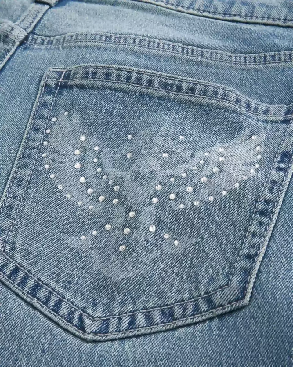 Comfortable denim jeans in a medium wash, designed with a baggy leg. Featuring an eagle graphic with shine details at the back pocket, fading.