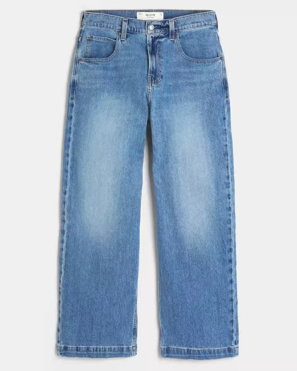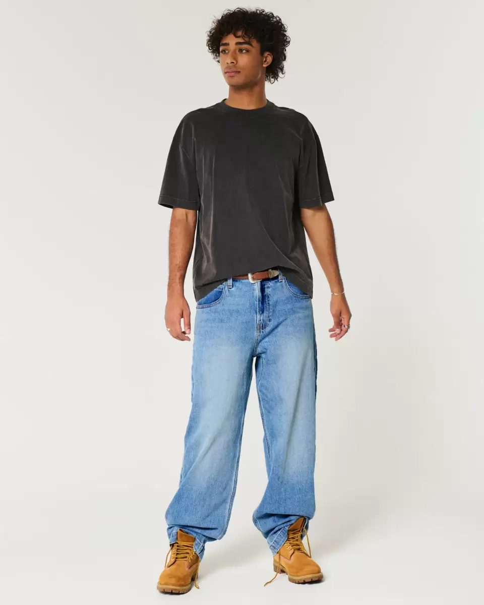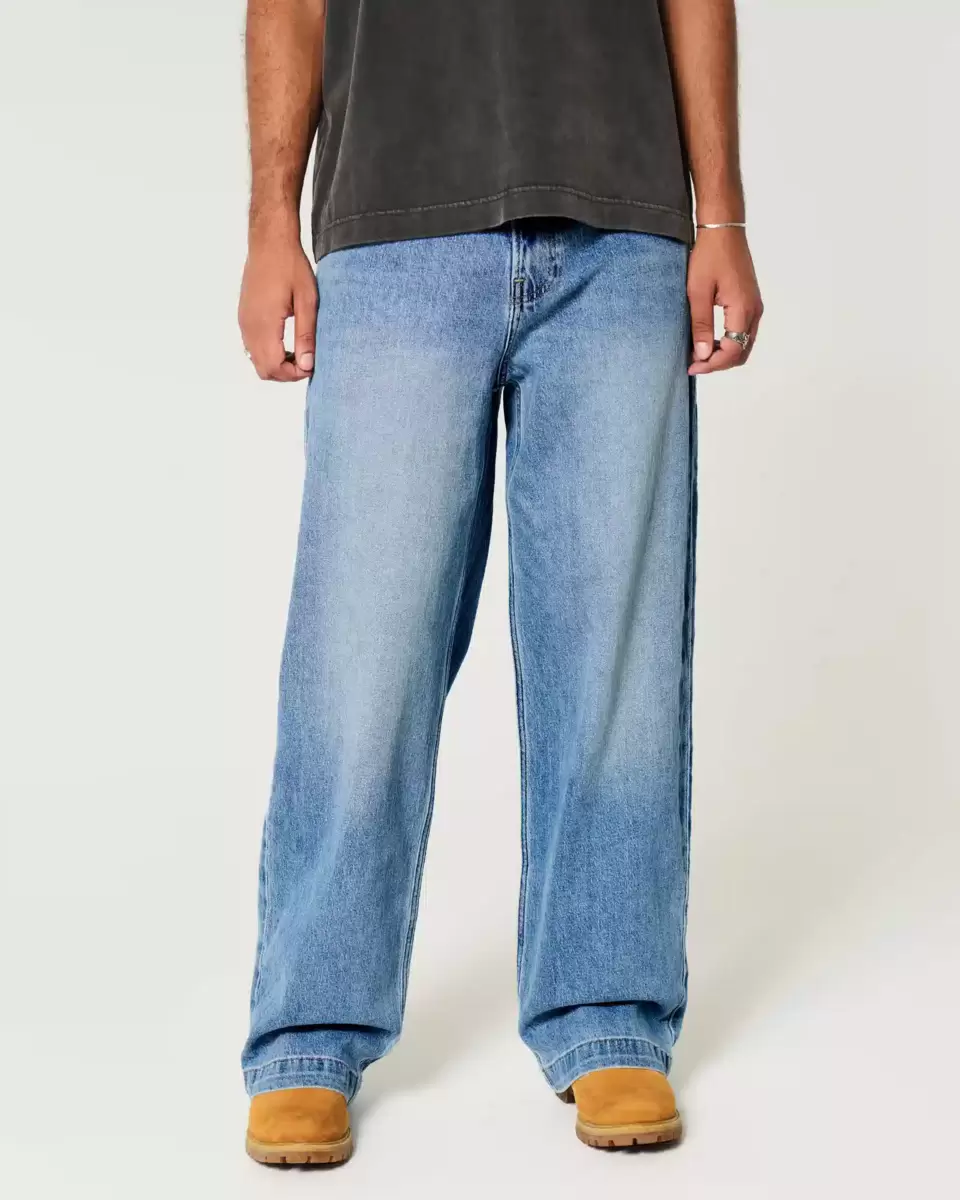 Ultra-comfortable jeans in a medium wash, designed with a super baggy leg. Fading and whiskering. Imported.