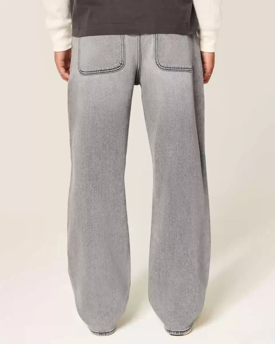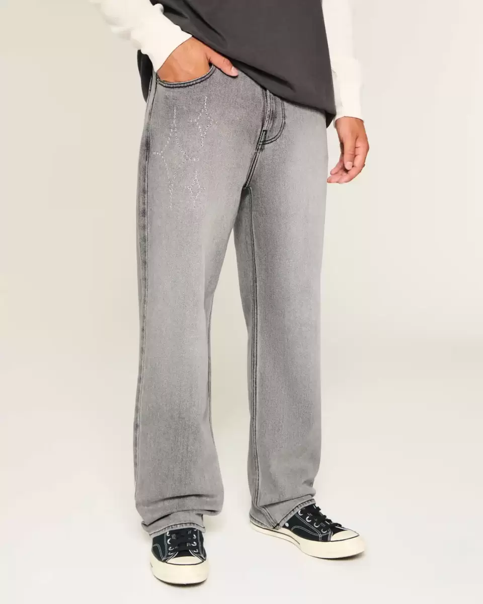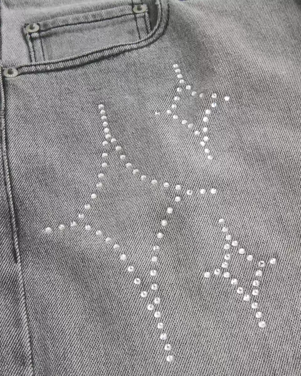 Comfortable denim jeans in washed black, designed with a baggy leg. Embellished diamond graphics, fading. Imported.