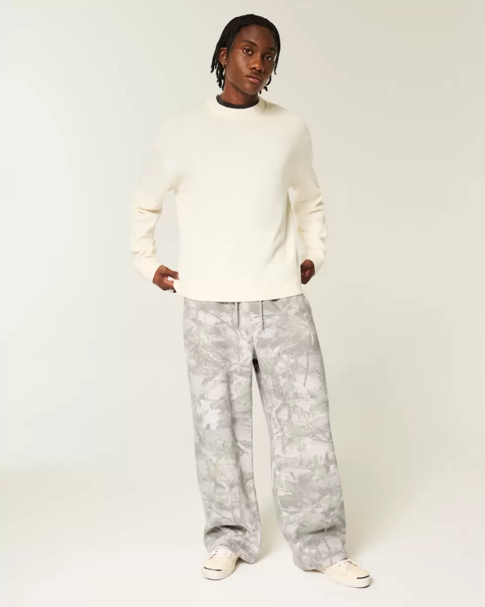 Comfortable fleece sweatpants with a super baggy leg and drawstring waist. Pockets, right zipper pocket, all-over camo pattern, embroidered logo detail. Imported.