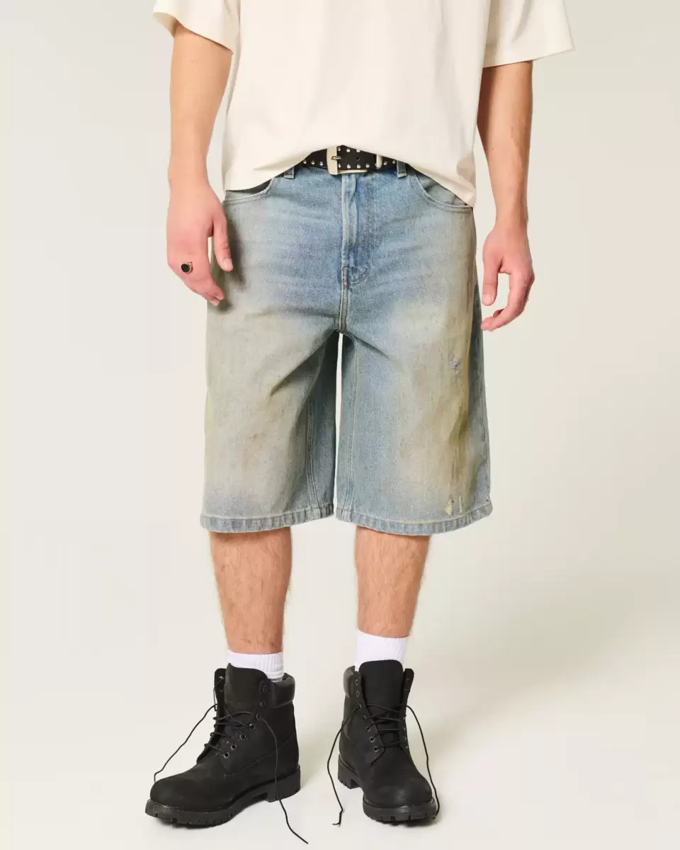 Comfortable denim shorts with greased and distressed details. Super baggy leg, fading, whiskering. Imported.
