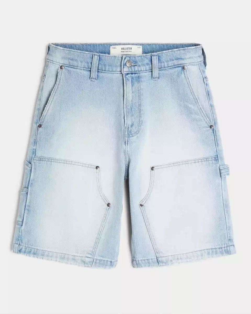 Classic painter-style denim shorts in a light wash, designed with a baggy fit. Left loop detail, extra pockets, fading, reinforced knee stitching. Hits at the knee. Imported.