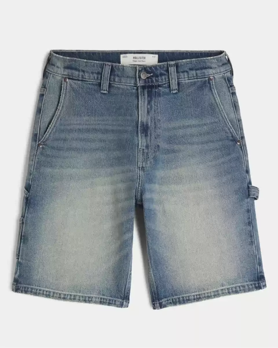 Classic painter-style denim shorts in a medium wash, designed with a baggy fit. Left loop detail, extra pockets, fading and whiskering. Hits at the knee.