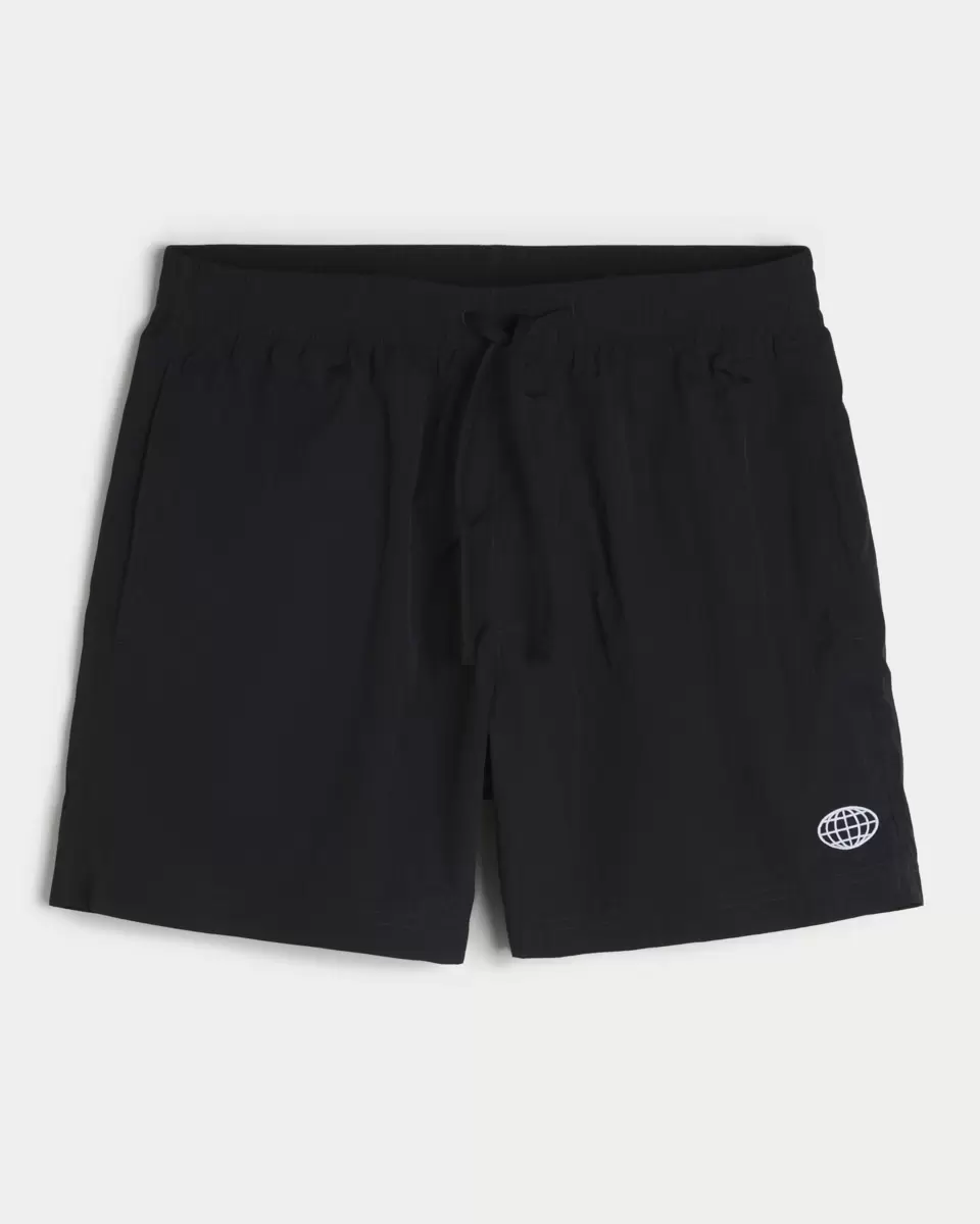 Classic soccer shorts that hit mid-thigh with an embroidered icon at the left leg. Drawstring waist, pockets. Imported.