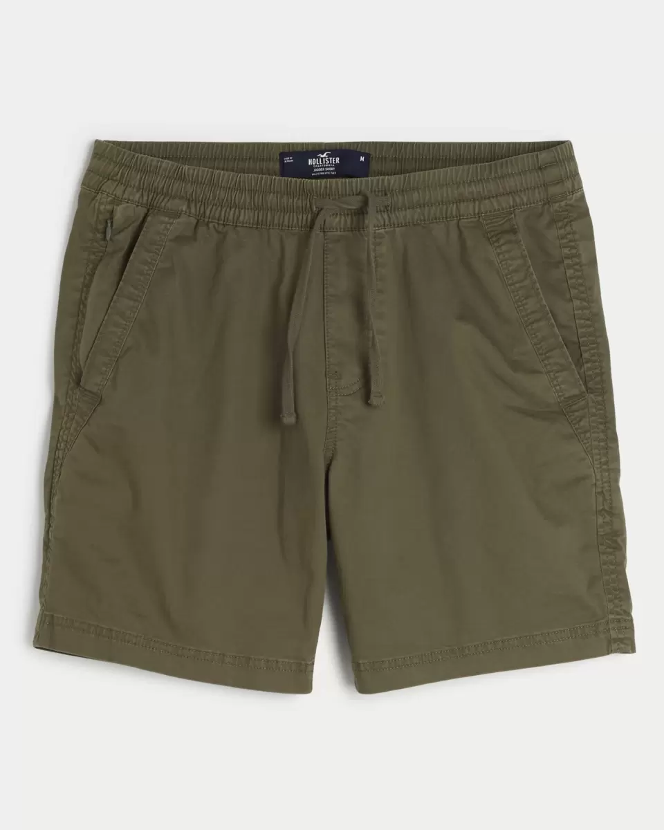 Comfortable pull-on shorts made with Hollister Epic Flex twill, featuring front pockets and a soft drawstring waist. Hidden phone pocket. Hits above the knee. 7″ inseam.
