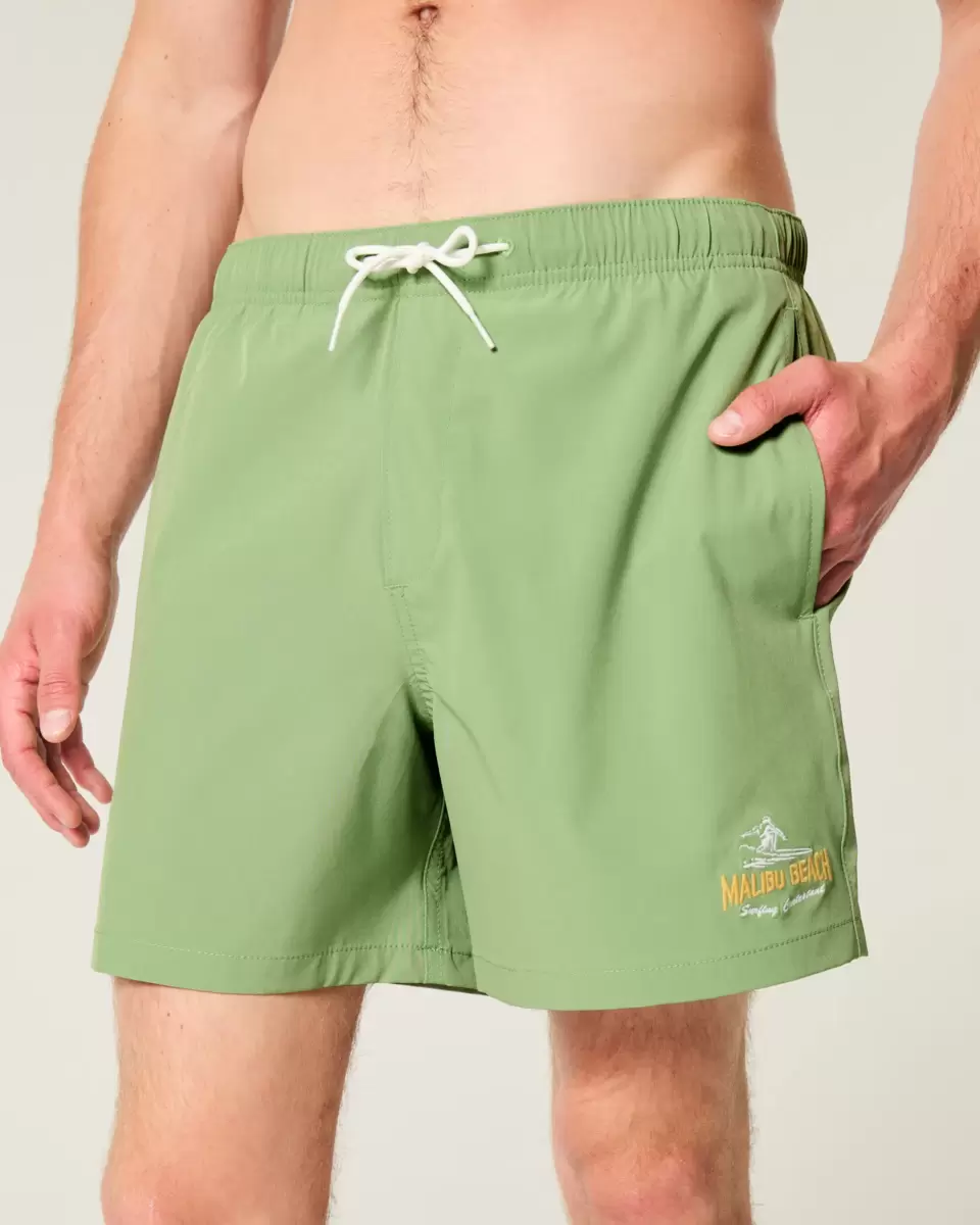 Shorter-length swim trunks that hit mid-thigh. Featuring comfortable 4-way stretch swim fabric and a 6″ inseam. Pockets, drawstring waist, embroidered Malibu Beach graphic. Imported.