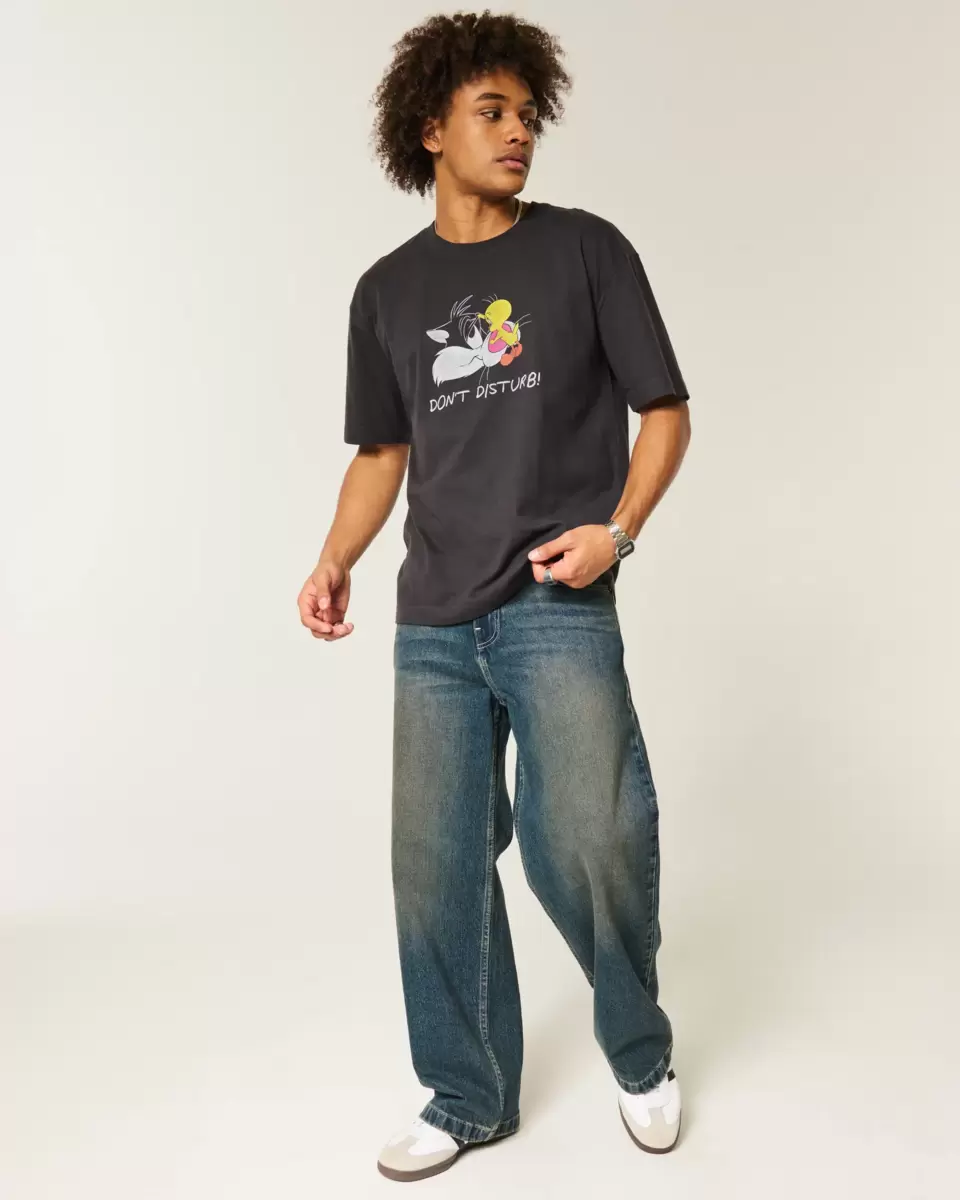 A super soft, heavyweight 100% cotton tee featuring official licensed Looney Tunes Sylvester and Tweety print graphics. Crew neckline, short sleeves. Boxy Fit.