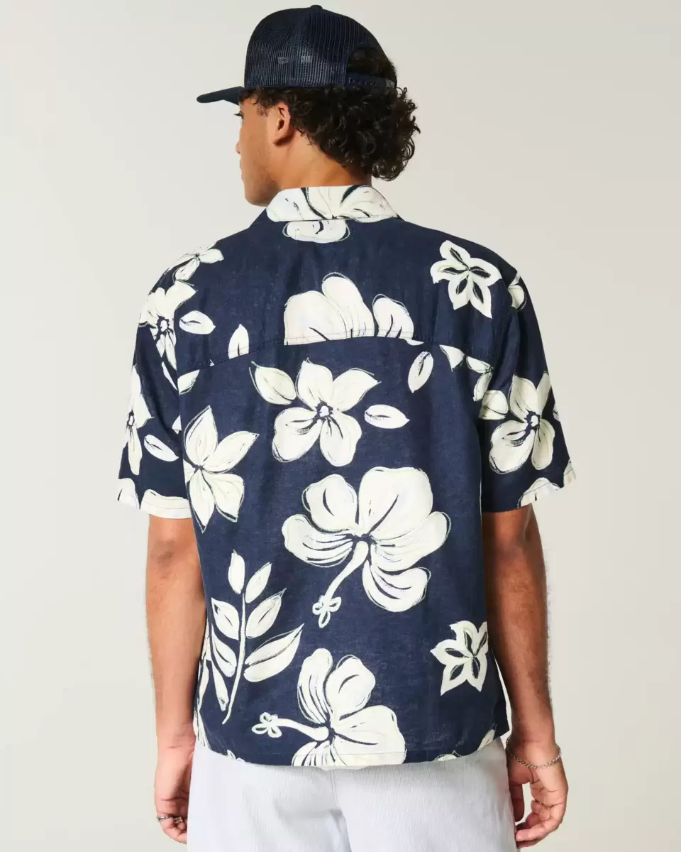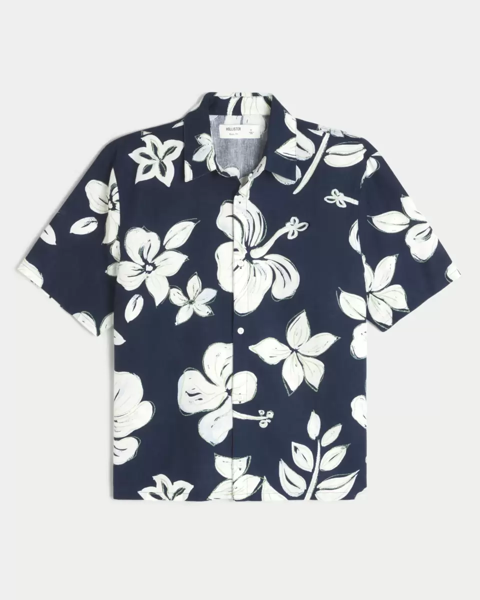 A classic, comfortable short-sleeve shirt in a soft linen blend with an all-over tropical pattern. Full button closure, collar. Boxy Fit. Imported.