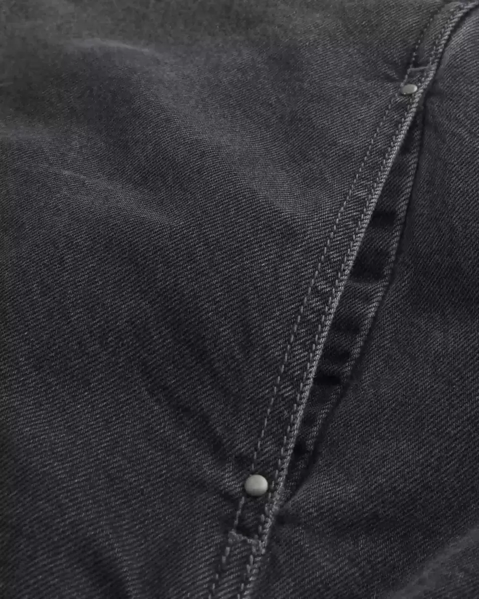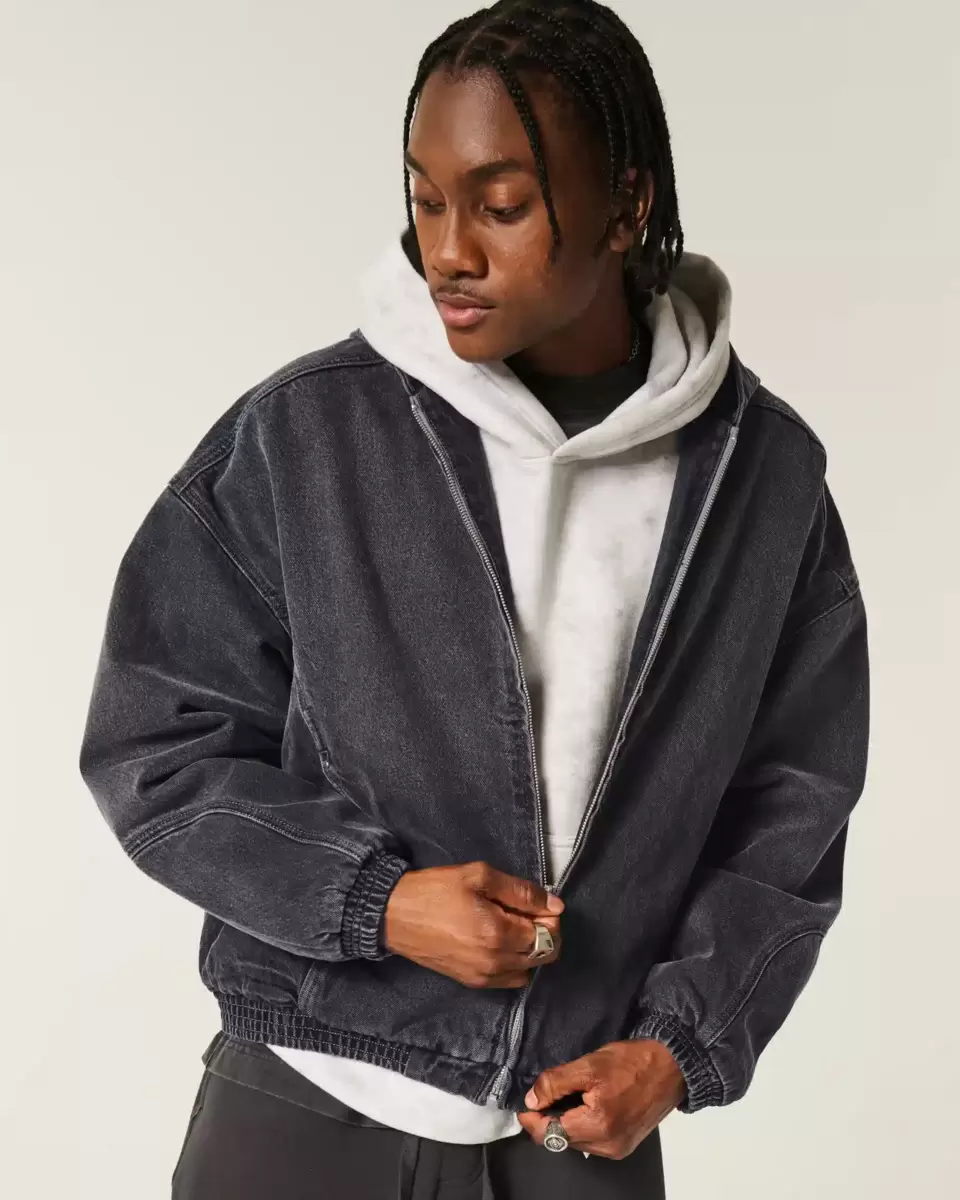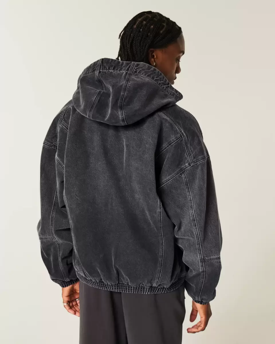 A classic skater-style jacket with a full zip-up closure. Front pockets, hood, denim exterior. Imported.
