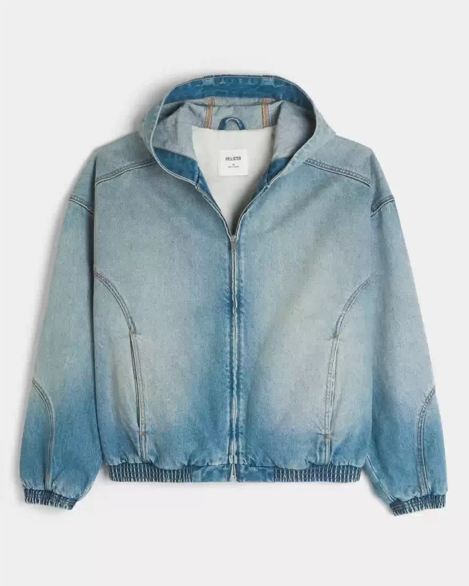 A classic skater-style jacket with a full zip-up closure. Front pockets, hood, denim exterior. Imported.