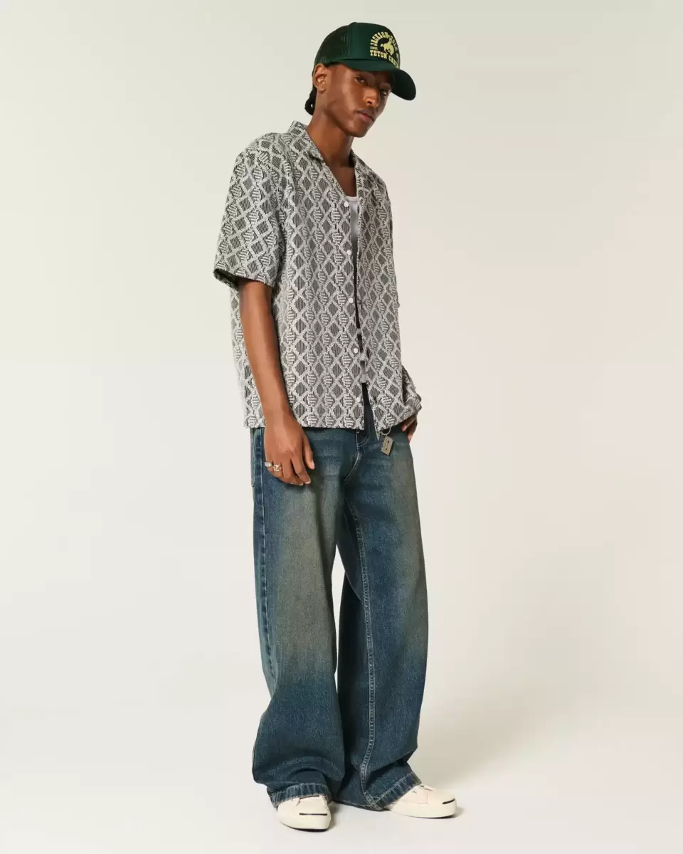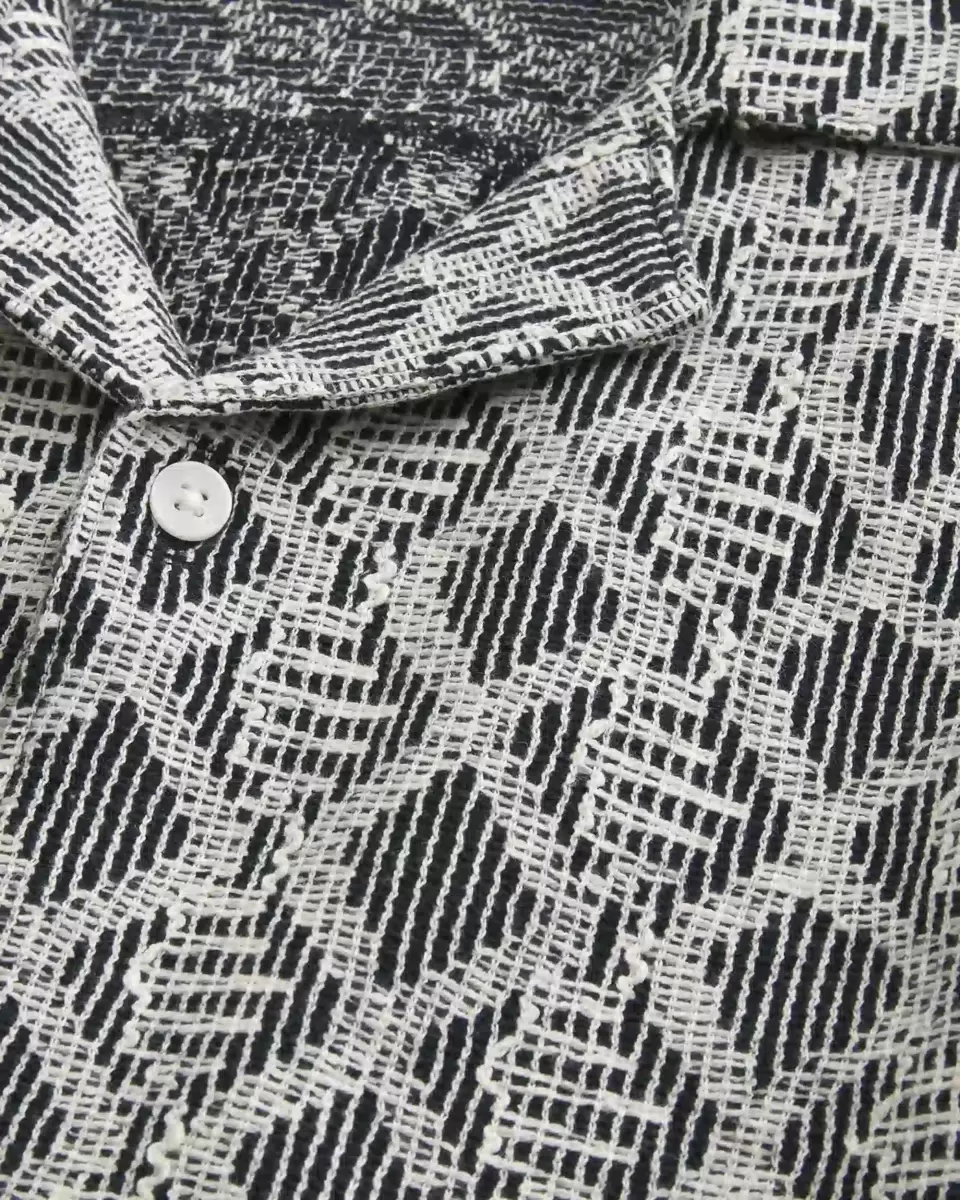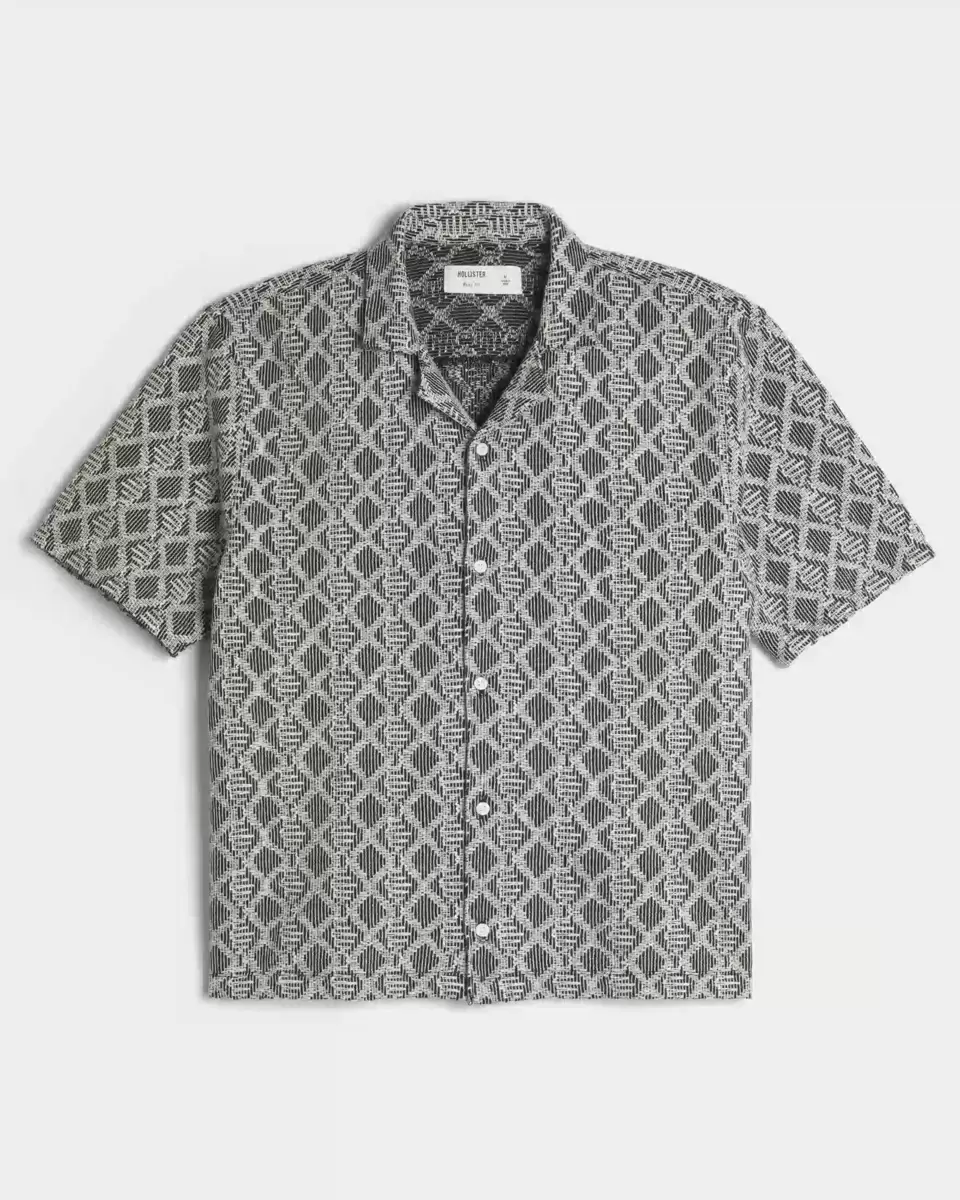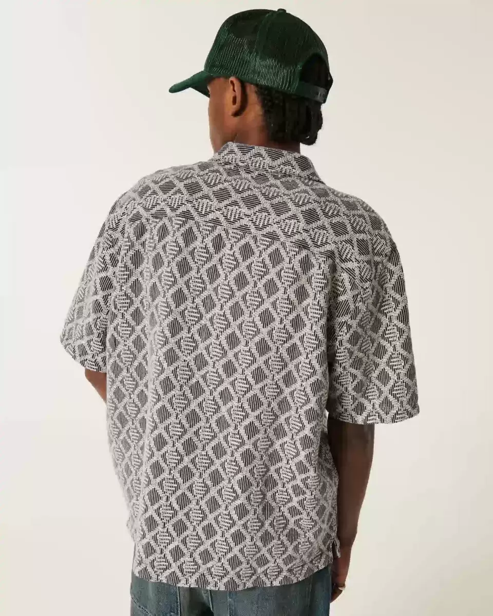 Made with soft crochet-style fabric, this classic button-through shirt features an all-over diamond pattern and short sleeves. Button closure, collar. Boxy Fit.