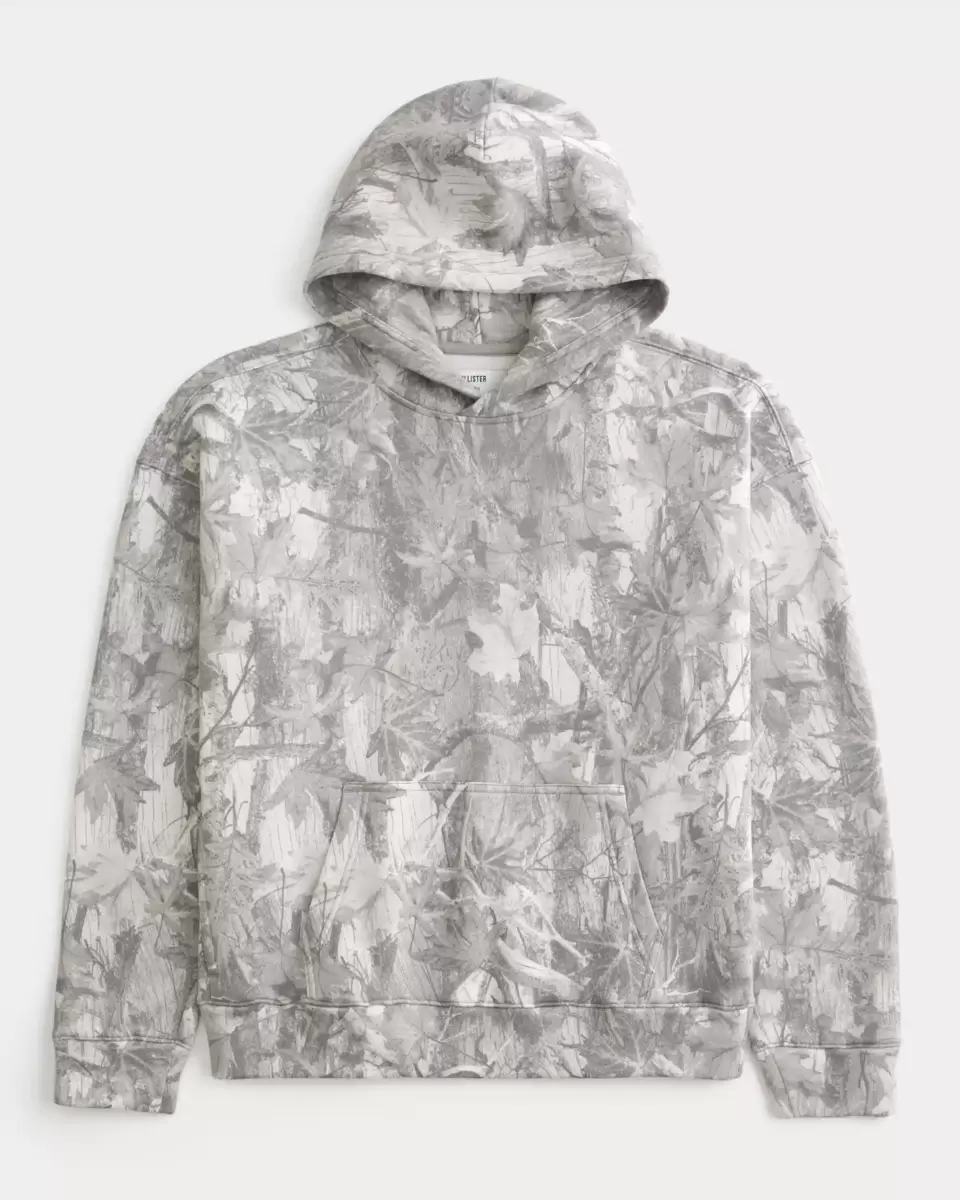 This super soft fleece hoodie features an all-over camo pattern. Hood, front pouch pocket, long sleeves. Boxy Fit. Imported.