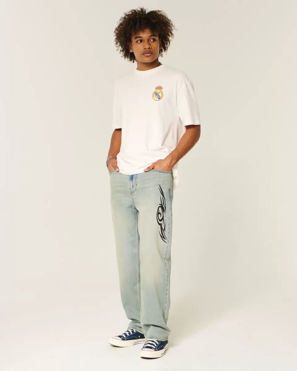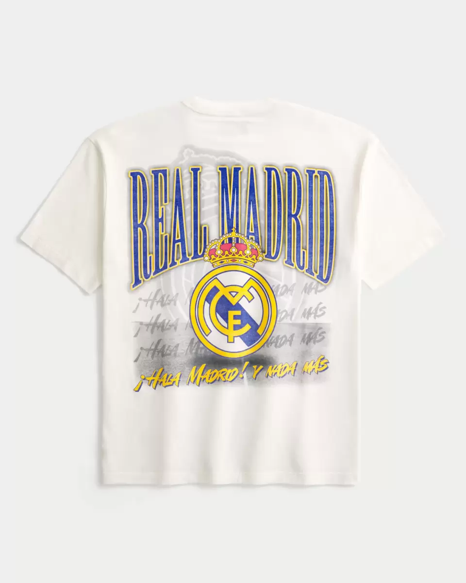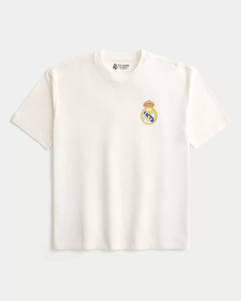 A super soft 100% cotton tee featuring official licensed Real Madrid CF print graphics at the left chest and back. Crew neckline, short sleeves. Boxy Fit. Imported.
