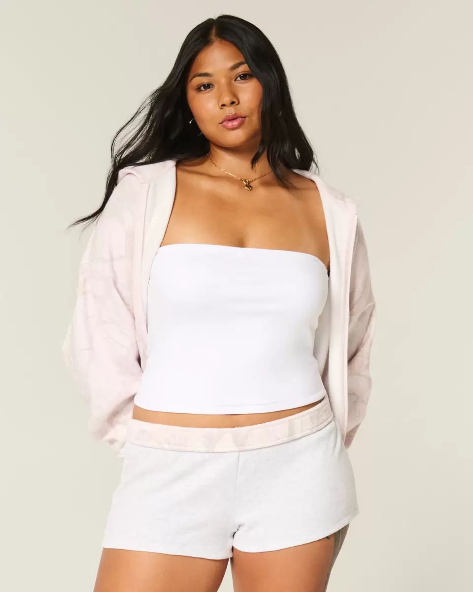 Super soft fleece mini shorts with a banded waist with interior camo pattern that looks cute folded over.