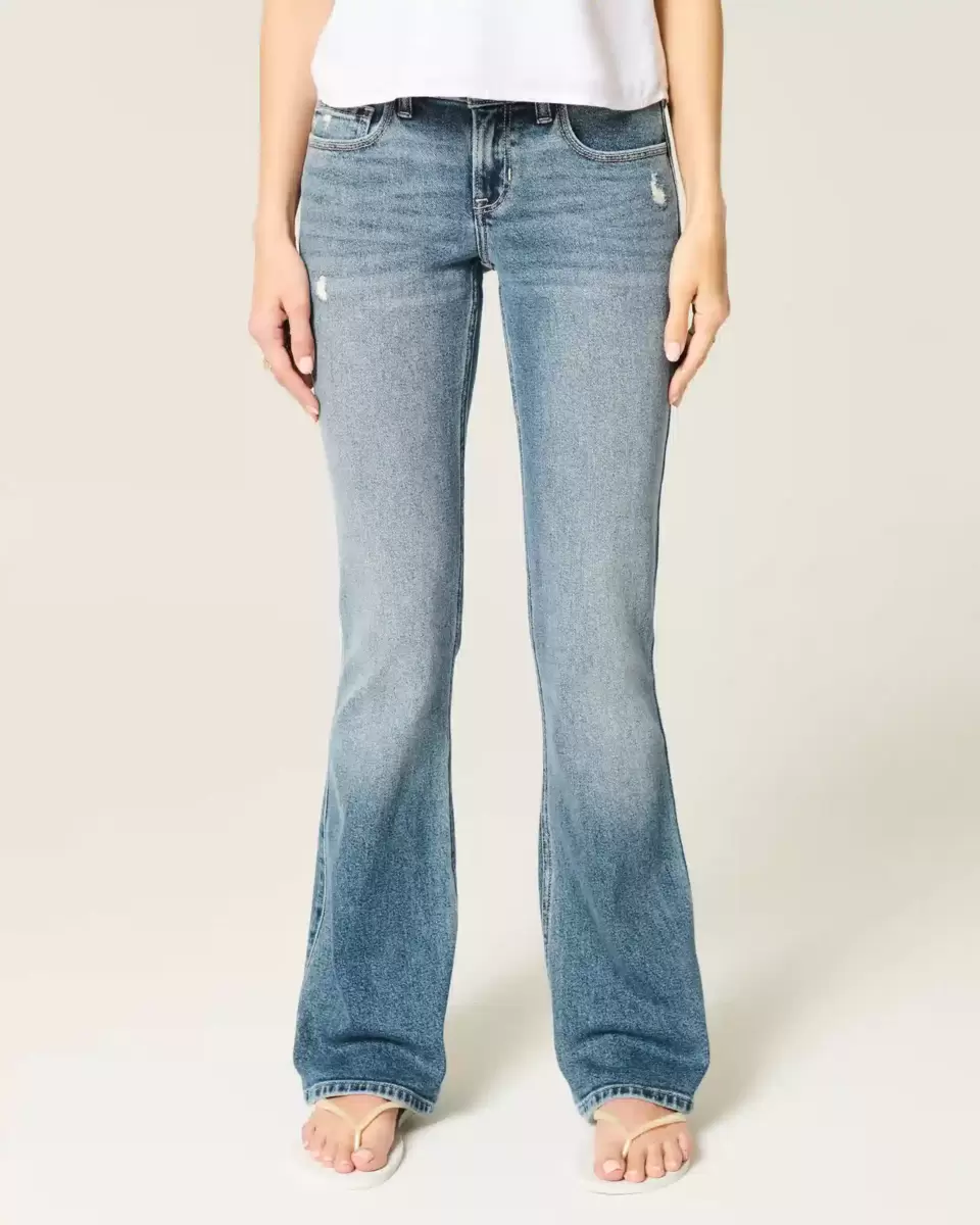 Comfortable denim jeans in a medium wash, designed with a flattering low-rise waist, slim leg and bootcut hem. Vintage Stretch denim with fading, whiskering and distressed details. Imported.