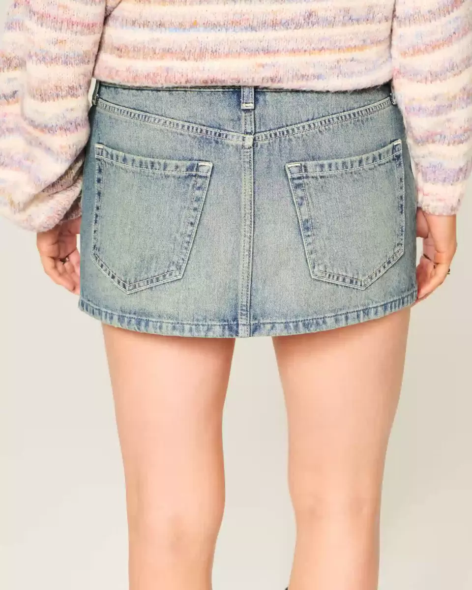 A cute and comfy denim mini skirt with fading and whiskering. Low-rise waist. Imported.
