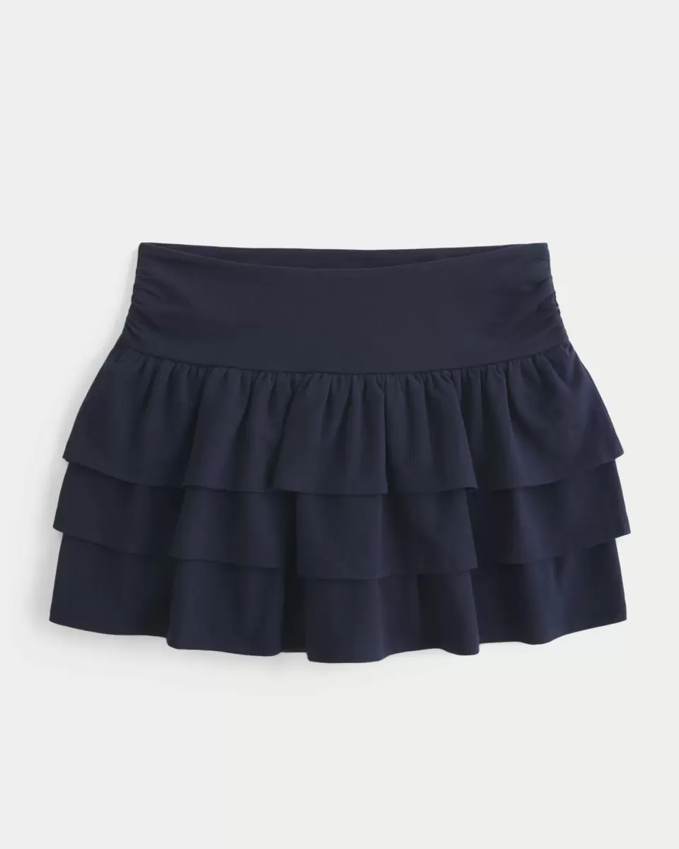 This cute mini skort is designed with a mid-rise waist and features hidden knit shorts with a side phone pocket. Soft and stretchy knit fabric, pretty ruffled tiers. Imported.