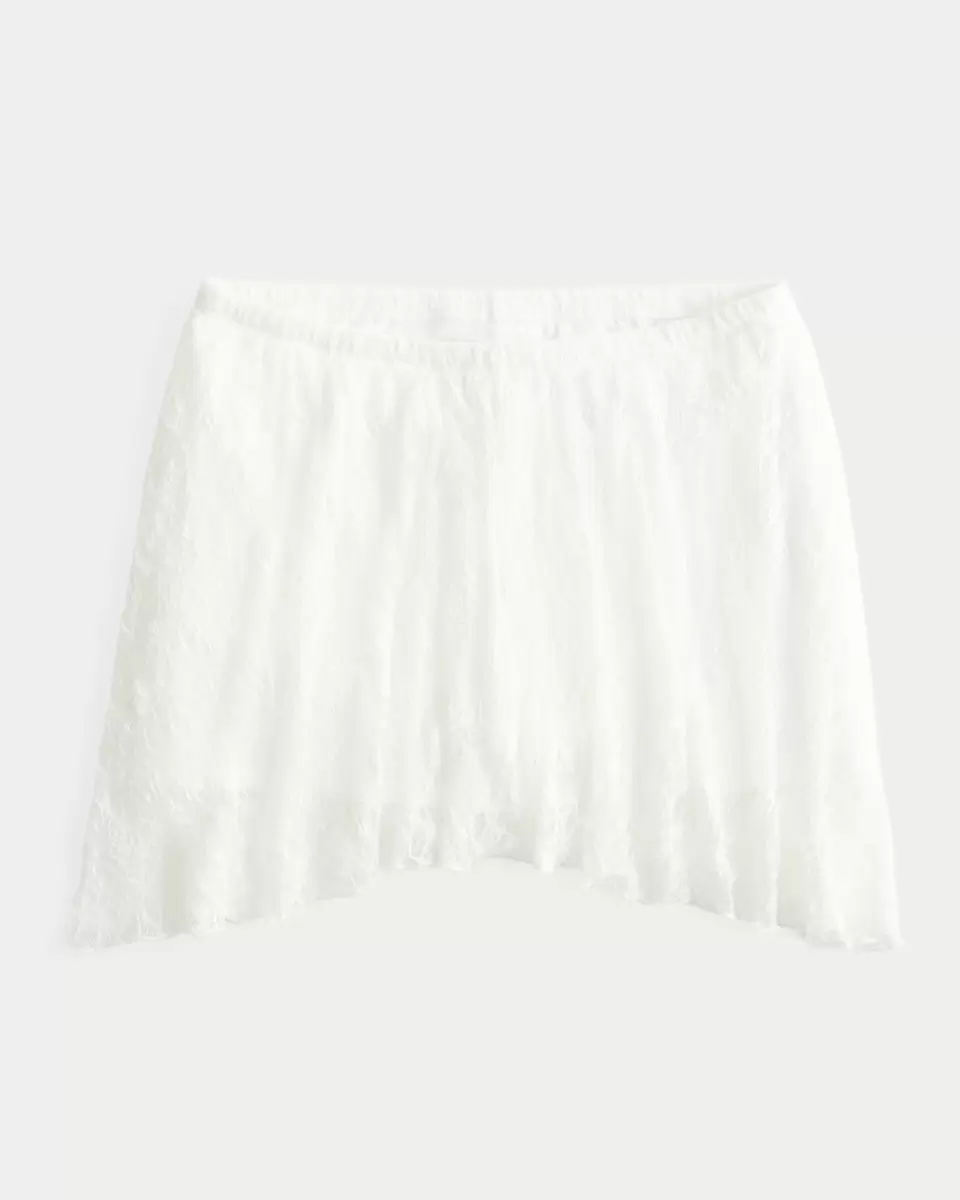 A flowy and super soft mini skirt in pretty lace fabric, designed with a mid-rise waist and asymmetrical hem. Imported.
