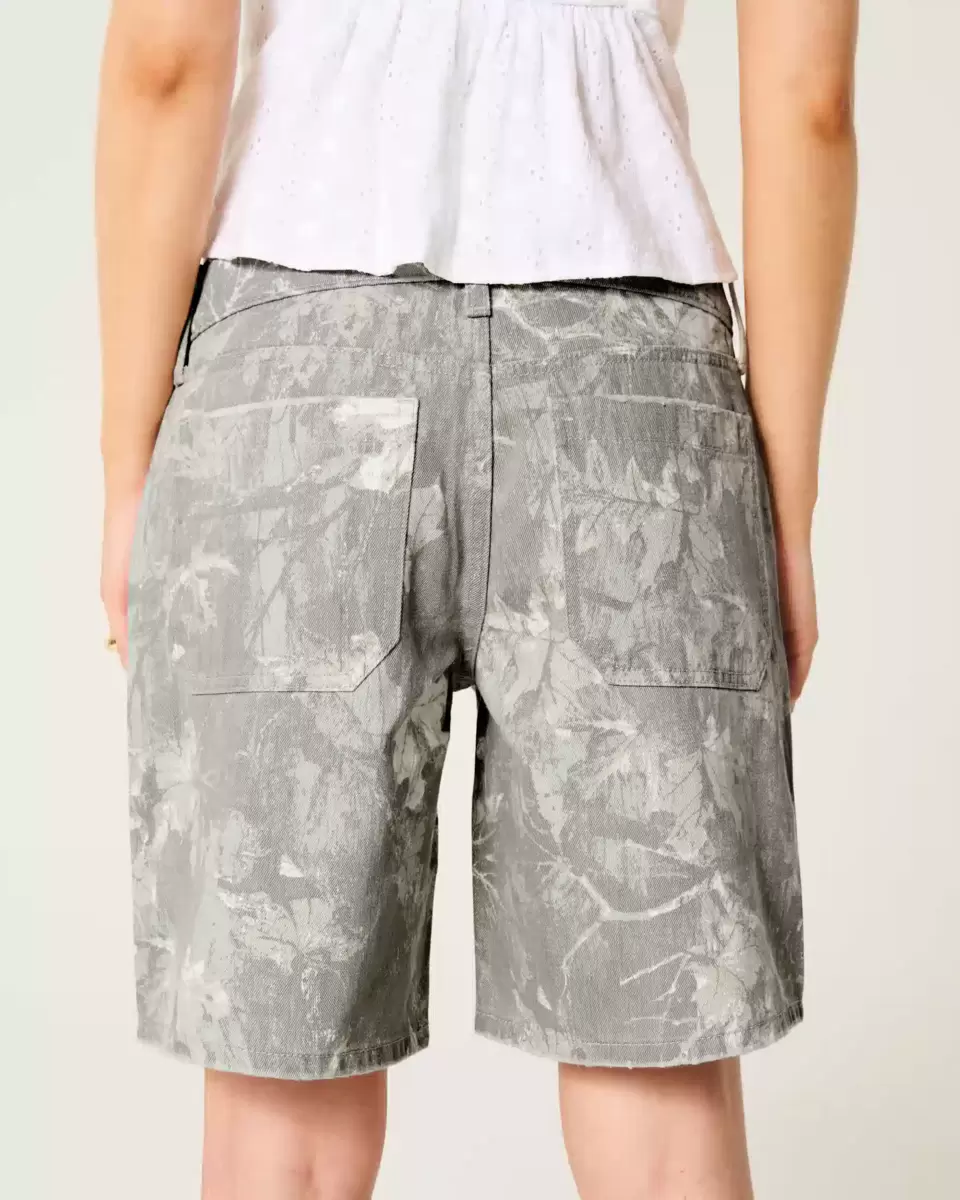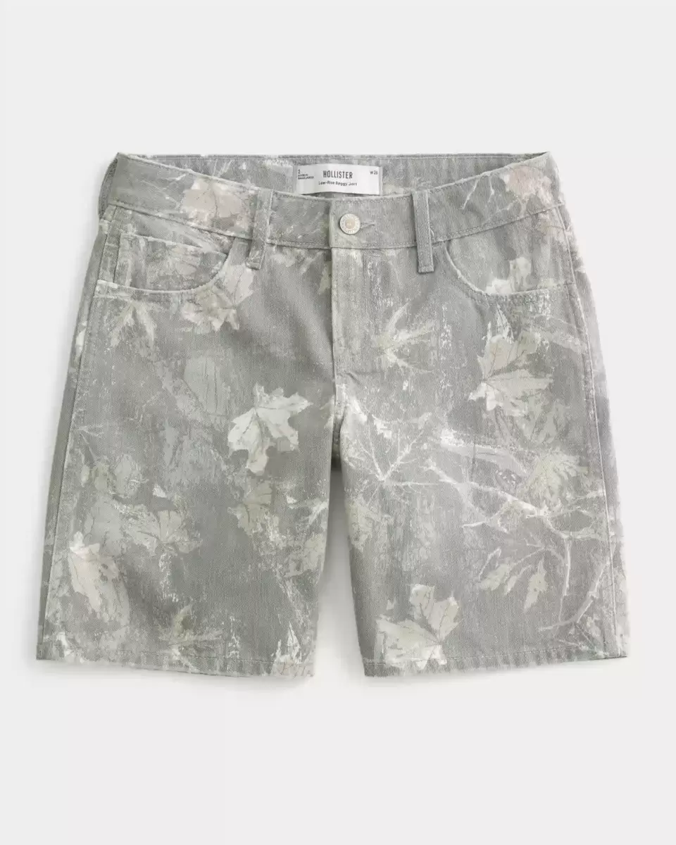 Cute and comfy denim shorts designed with a low-rise waist and baggy fit. All-over camo pattern. Imported.