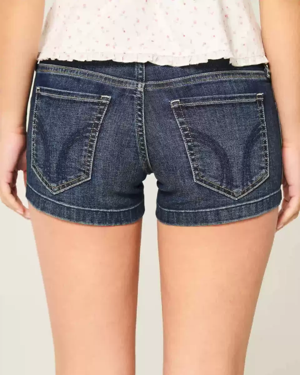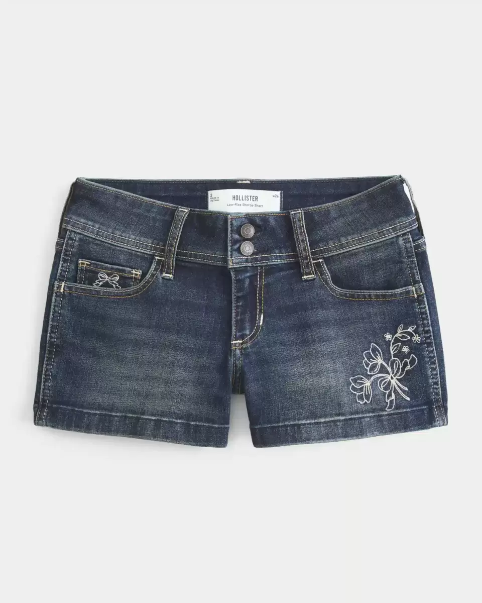 Comfy denim shortie shorts in a dark wash, featuring pretty floral embroidery and an embroidered bow detail at the right coin pocket. Low-rise waist, fading, whiskering. Imported.