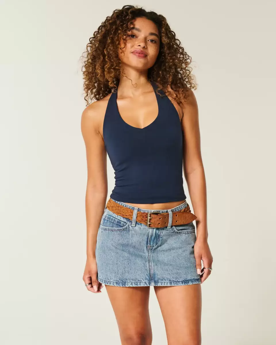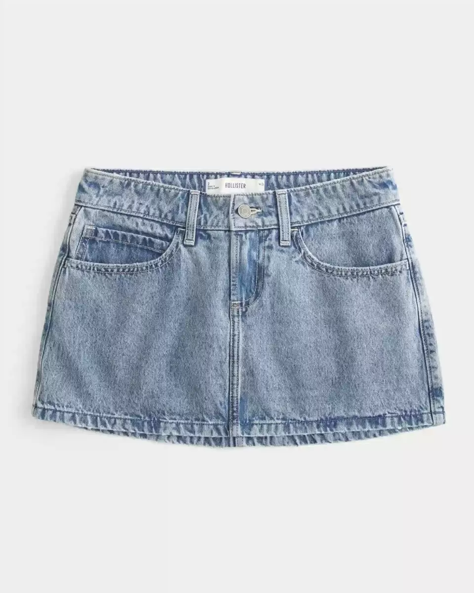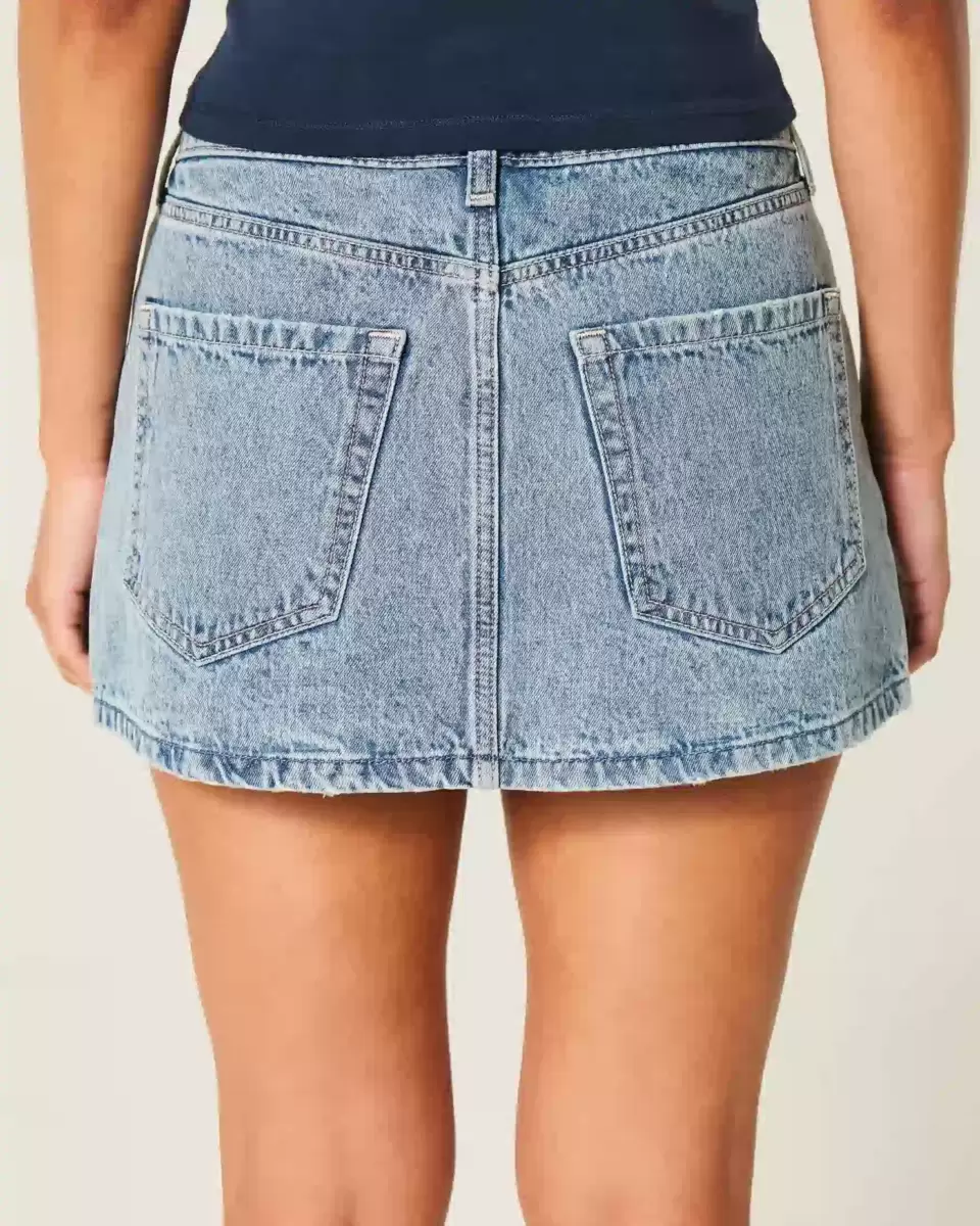 A cute denim mini skort designed with a low-rise waist and hidden knit shorts.