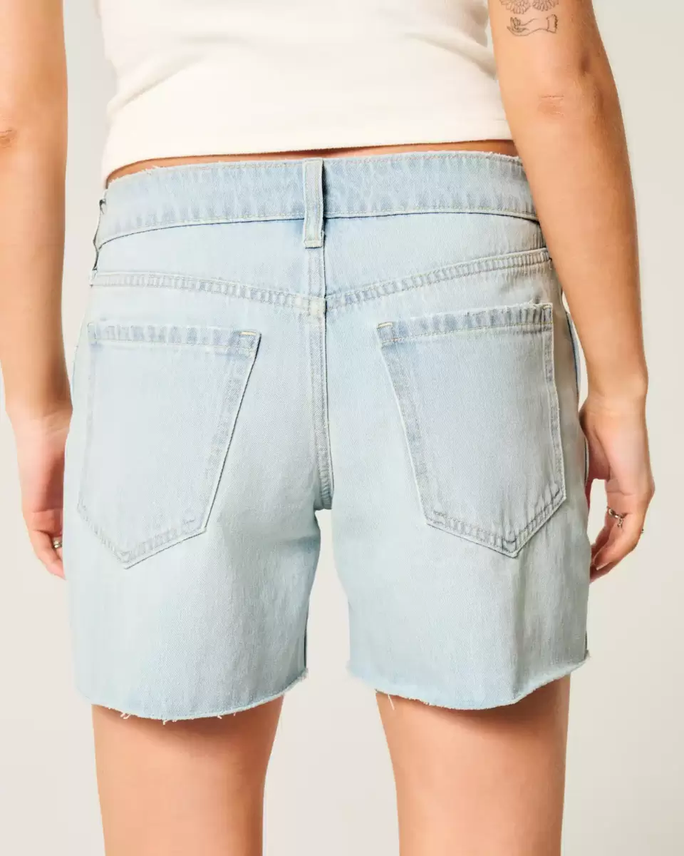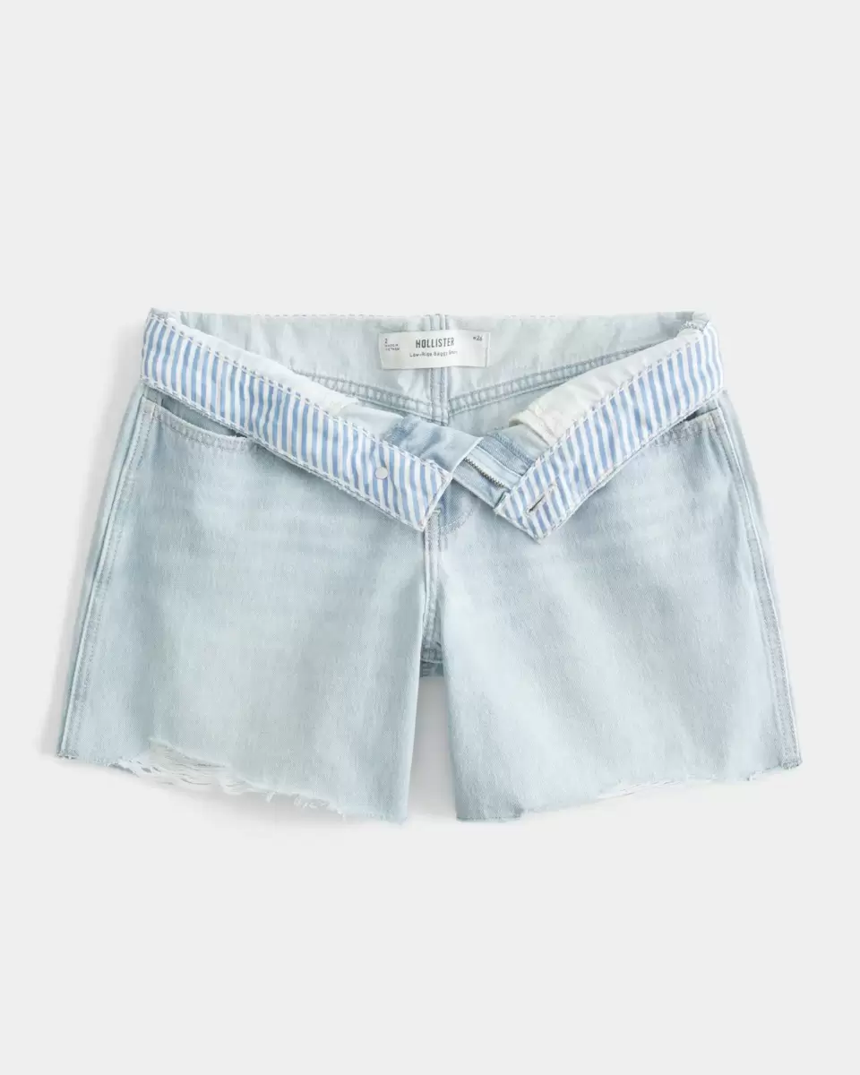 Cute and comfy denim shorts in a light wash, featuring a striped pattern at the inner waist. Frayed hems, low-rise waist, baggy fit, 5″ inseam. Imported.