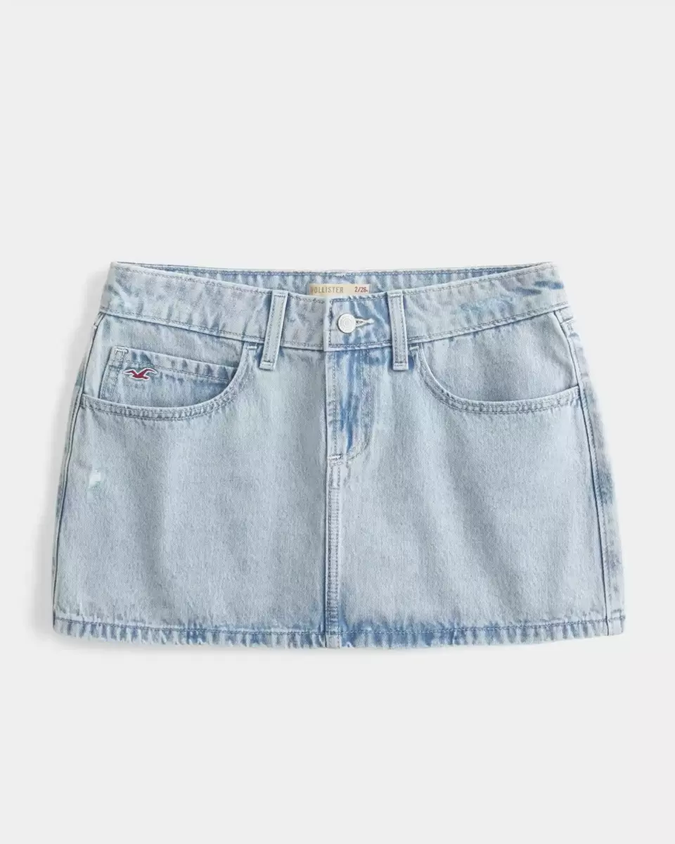 A cute denim mini skort in a light wash, designed with a low-rise waist and built-in shorts with a phone pocket. Imported.