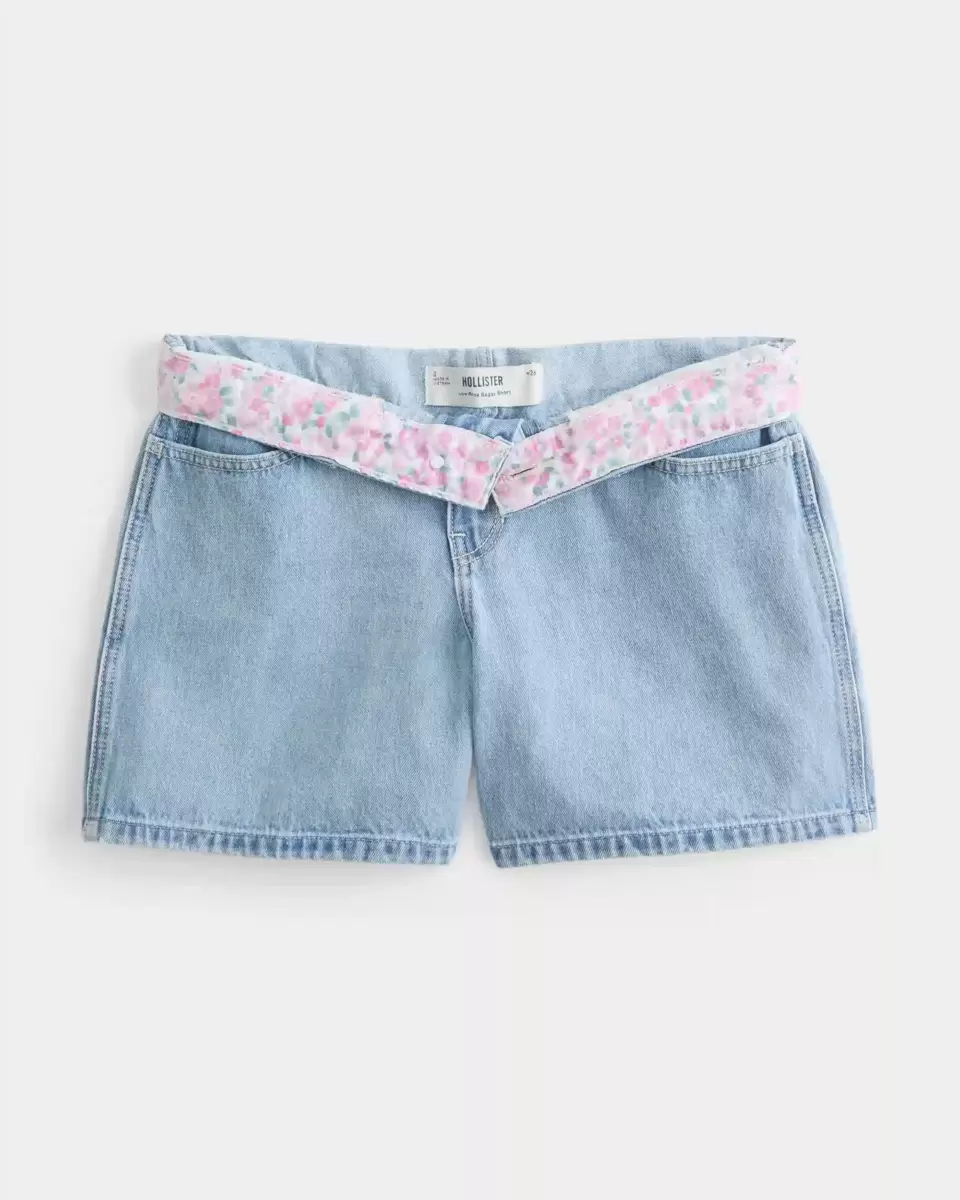 Cute and comfy denim shorts designed with a low-rise waist and baggy leg. Medium wash, floral interior waist pattern, 5″ inseam.