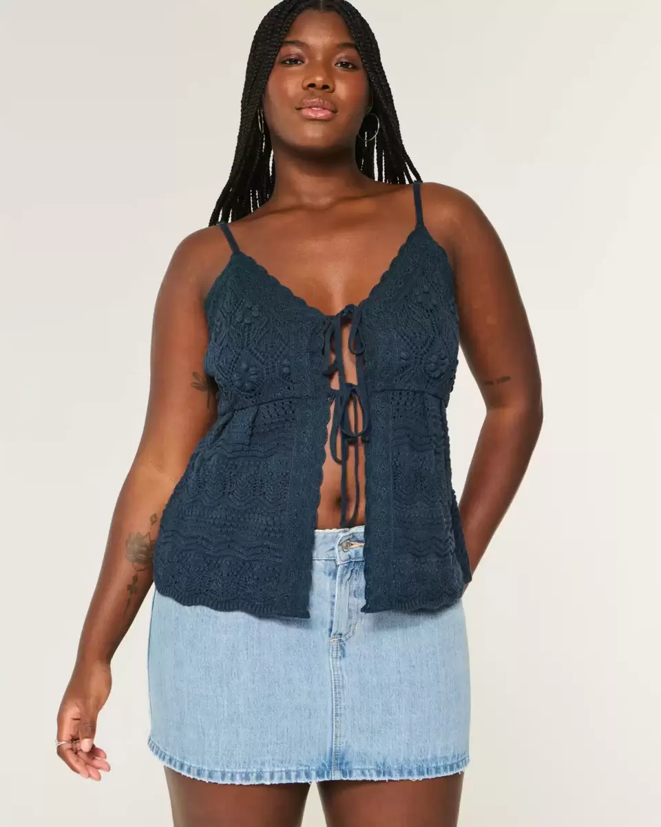 This cute denim mini skort features hidden knit shorts and a low-rise waist.