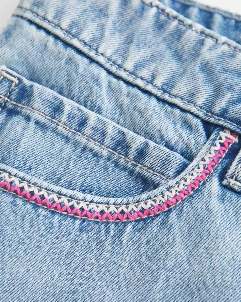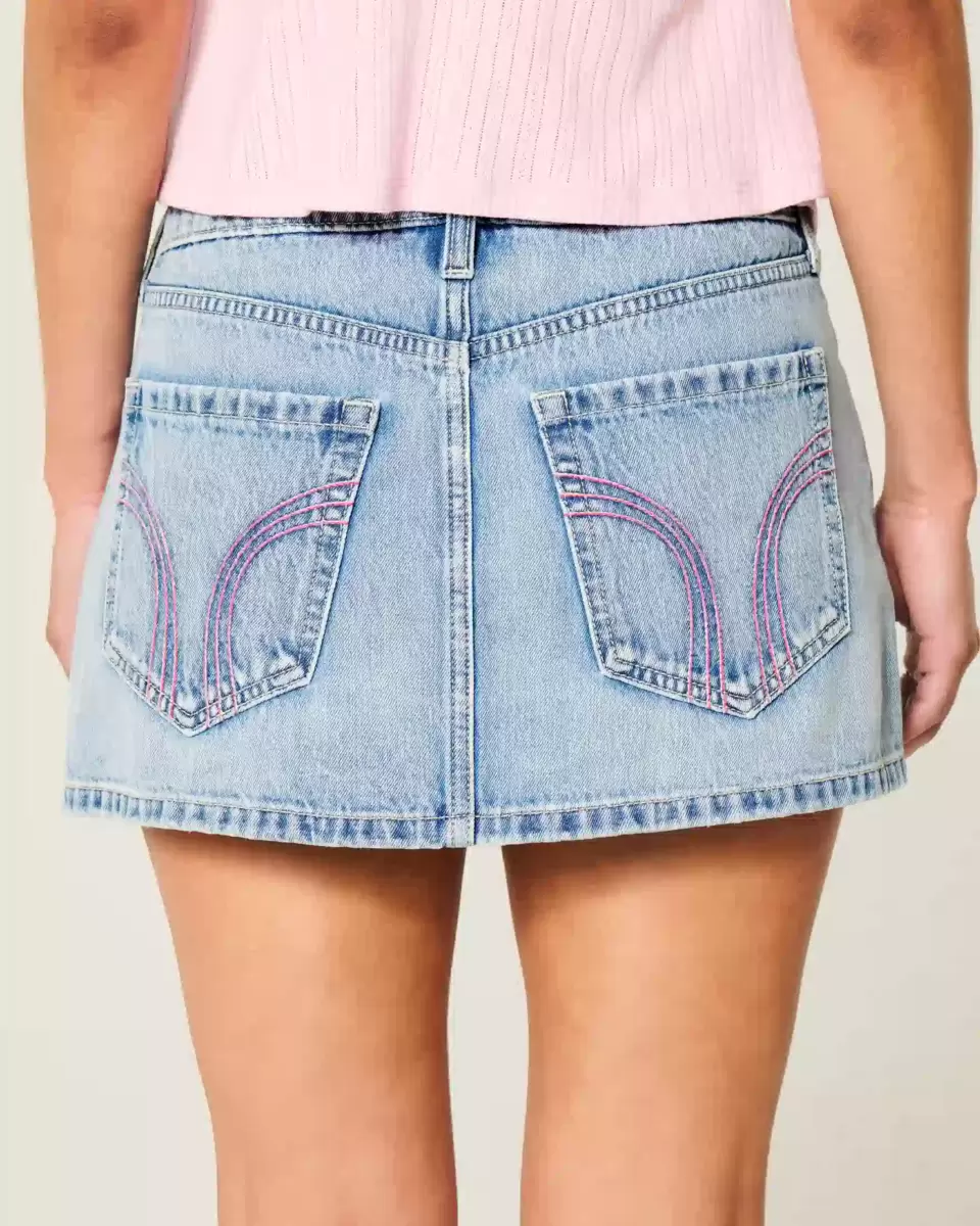 A cute, comfortable denim mini skort featuring pink and white embroidered stitching at the pockets. Built-in shorts with phone pocket, light wash, low-rise waist.