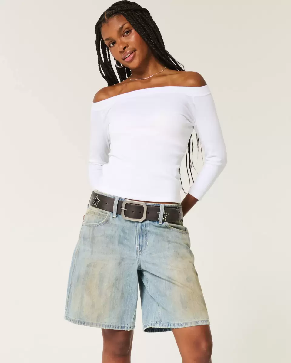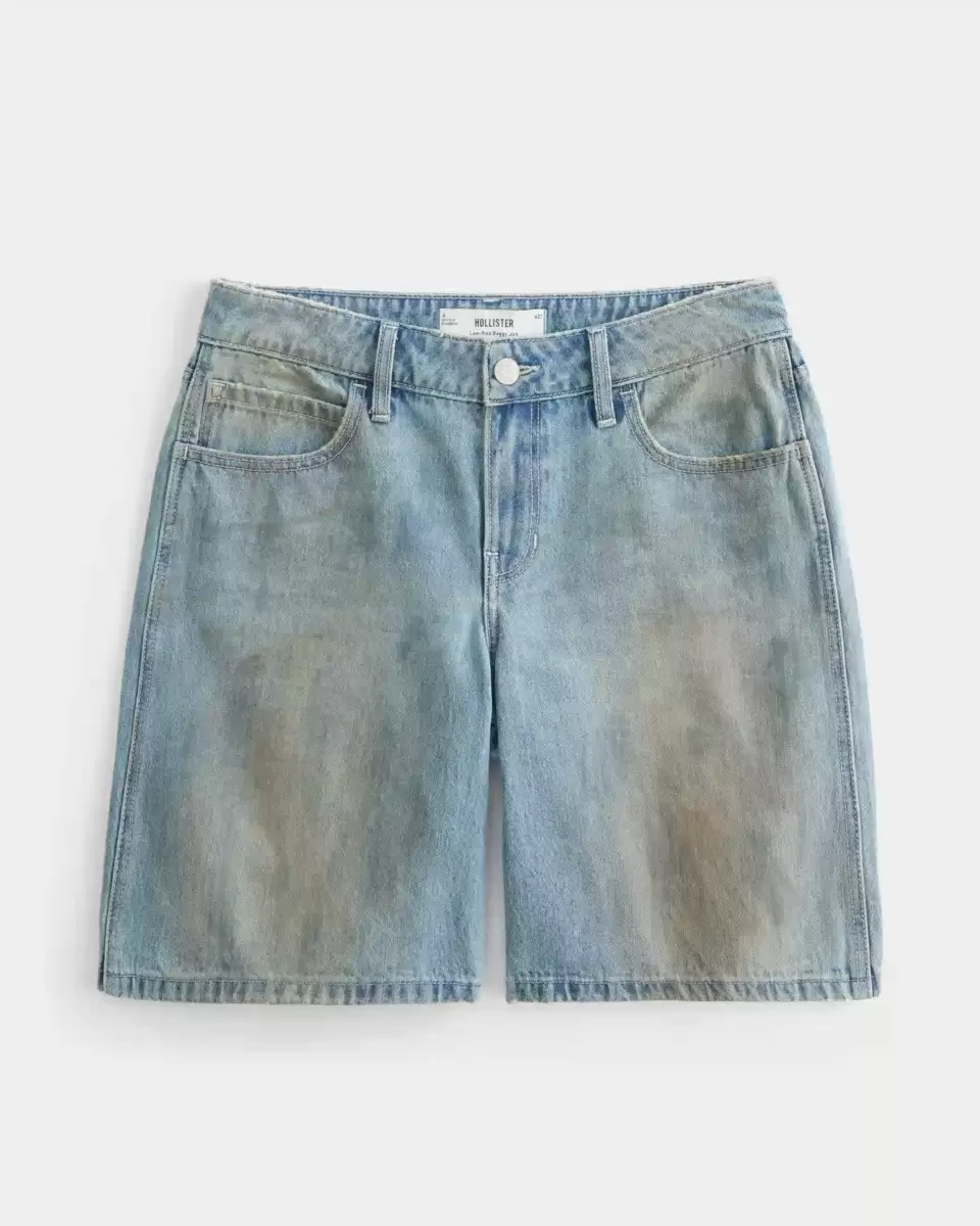 Comfortable denim shorts designed with a flattering low-rise waist and baggy leg. All-over mud wash effect. Imported.