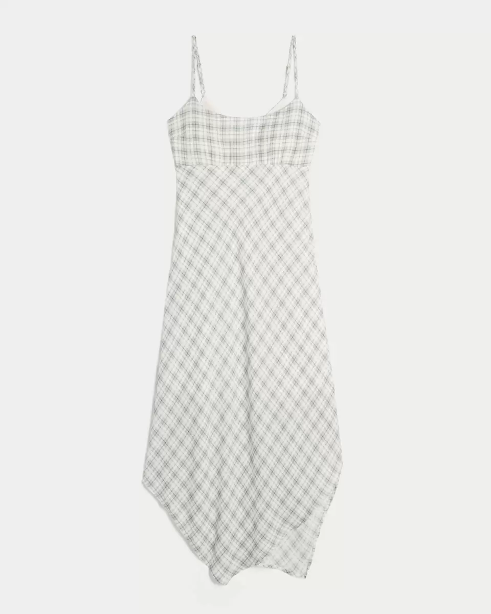 Flowy and super soft, this midi-length dress features an asymmetrical hem and adjustable straps. Imported.