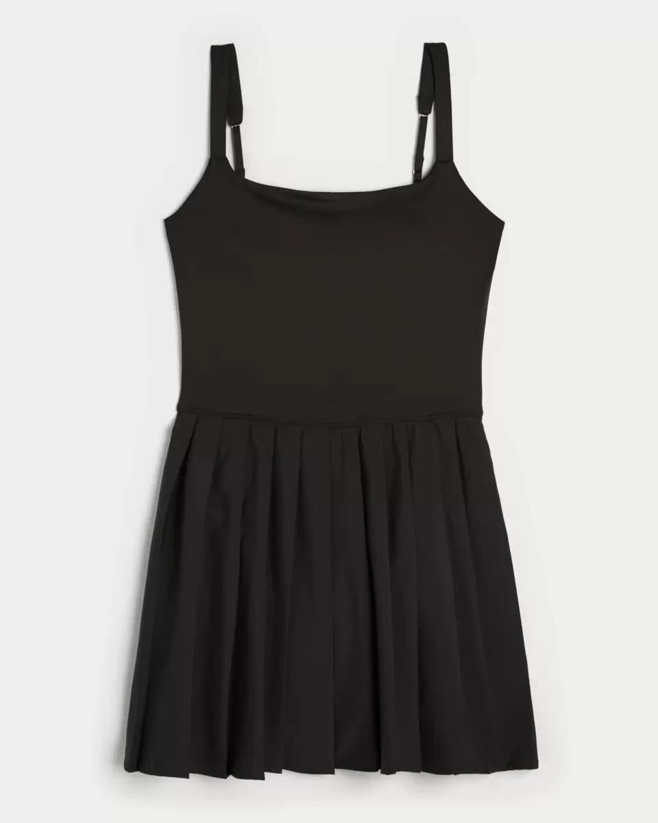 This cute and comfy active dress features a built-in shelf bra with removable pads and built-in bathroom-friendly shorts. Adjustable straps, pretty pleated skirt. Imported.