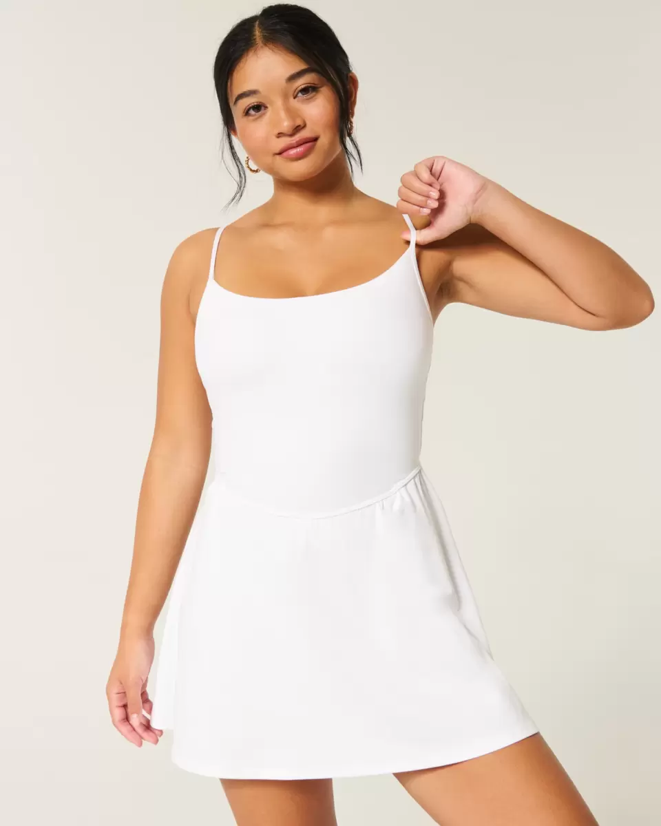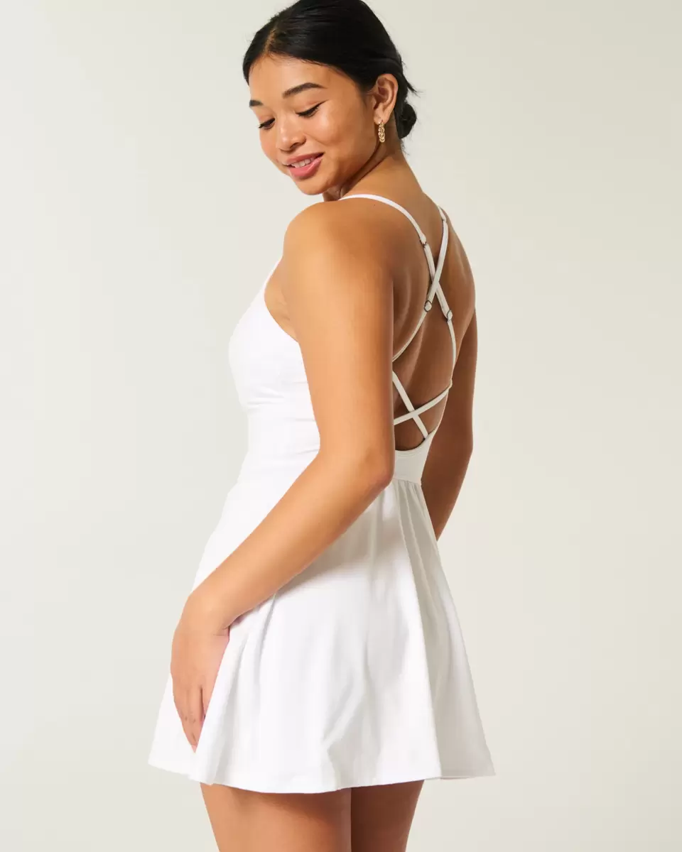 This super cute dress is made with soft active fabric and features built-in shorts with pocket. Strappy back, adjustable straps. Imported.
