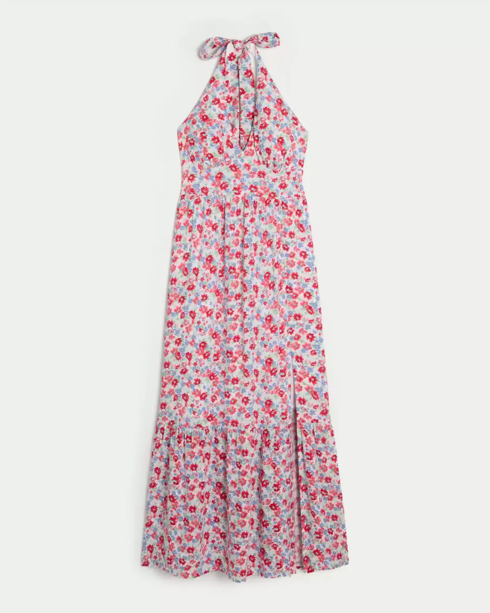 Flowy and super soft, this dress features halter straps and an open back detail. Removable pads, pockets, maxi length. Imported.