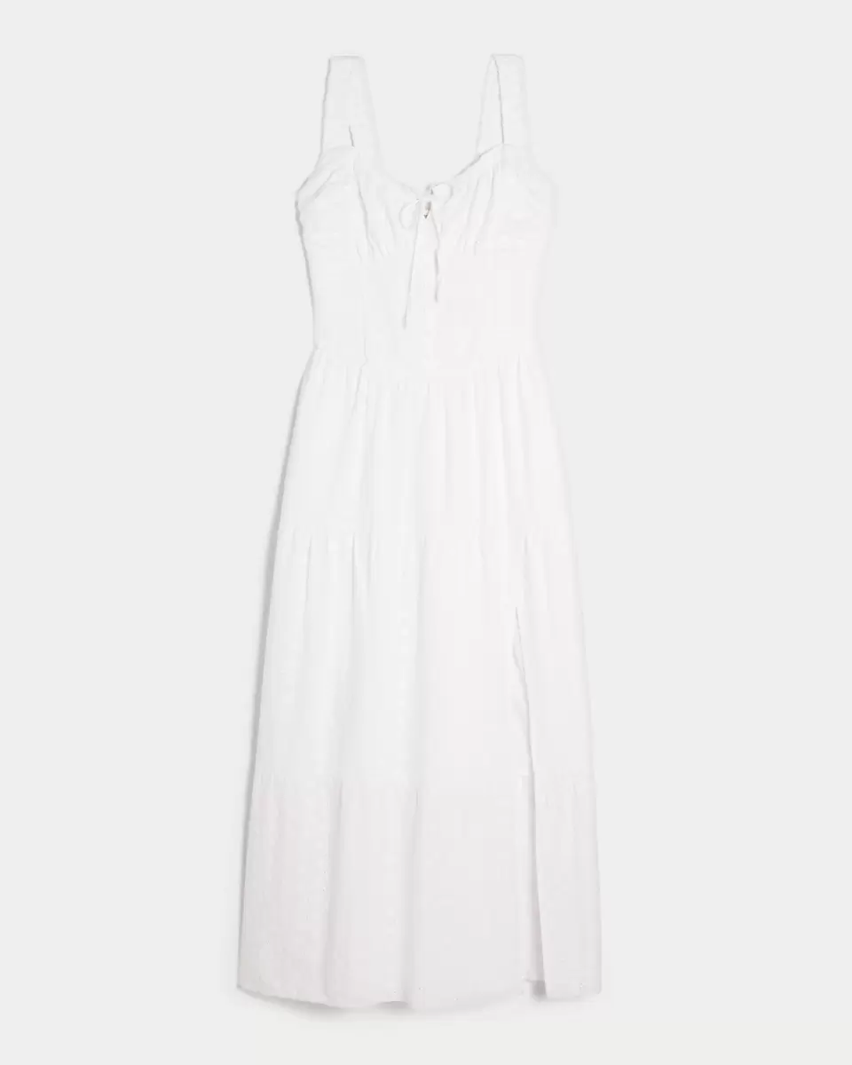 This super cute and ultra-soft maxi-length dress features flattering side smocking, ruched detailing at the bust and a center tie detail at the neckline. Split hem detail, sweetheart neckline, tiered skirt, button details, all-over eyelet embroidery. Imported.