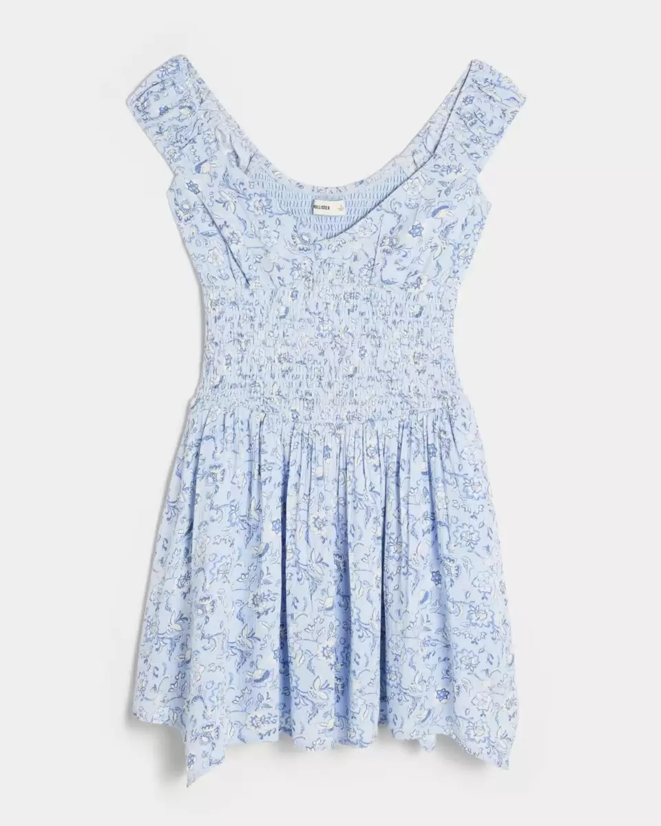 Super soft and pretty, this off-the-shoulder mini dress features pockets and a smocked waist. Asymmetrical hem.