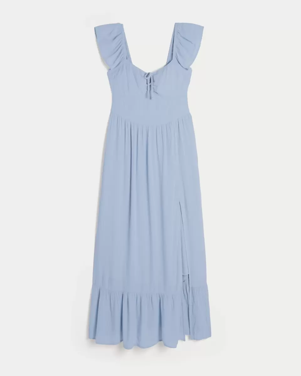 Flowy and super soft, this maxi-length dress features a split hem detail, flutter sleeves and a center tie detail at the neckline. Imported.