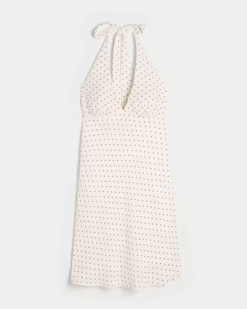 Flowy and super soft, this dress features halter straps, an open back detail and removable pads. Mini length, pretty crepe fabric. Imported.