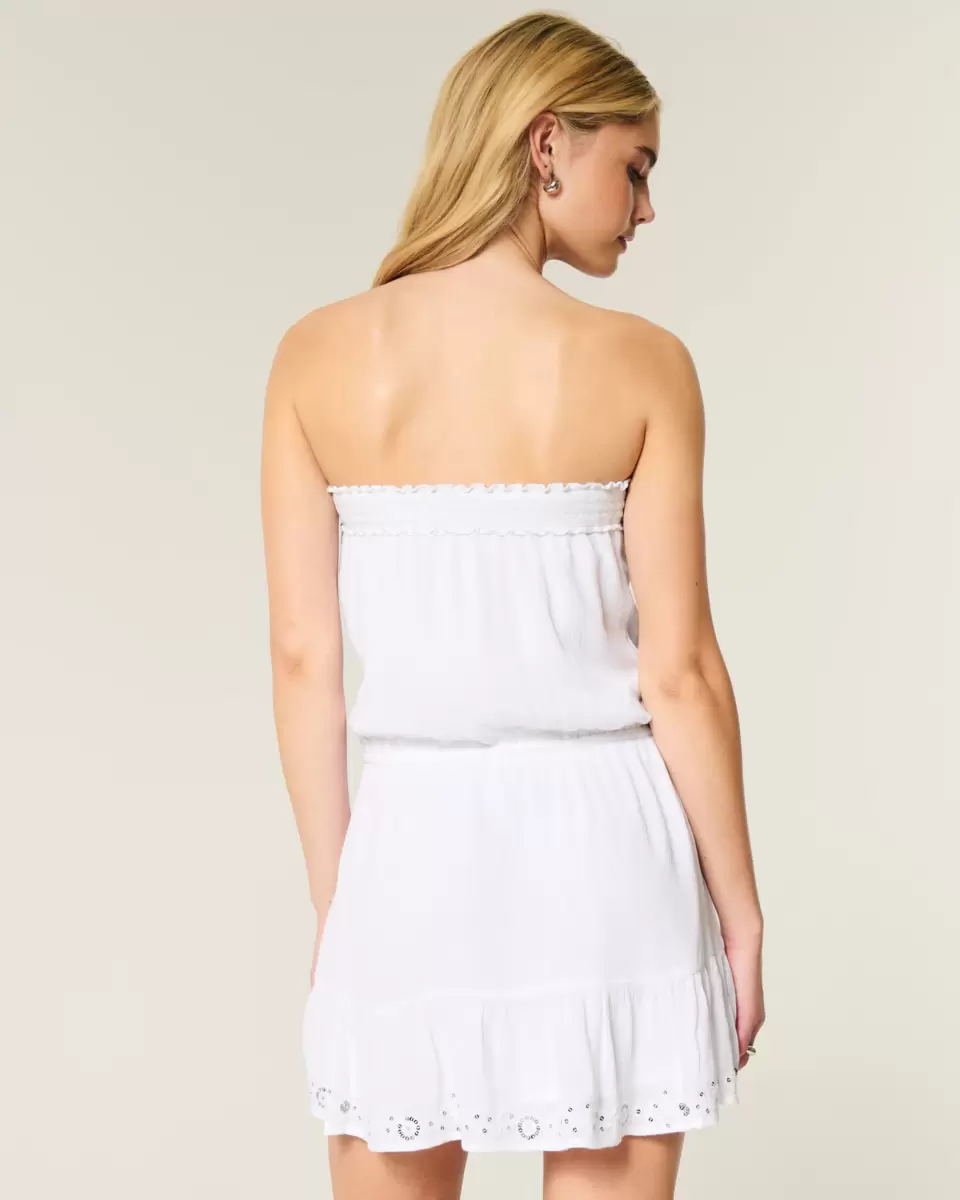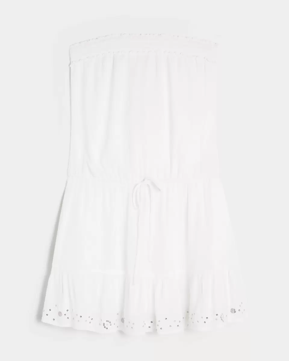 Pretty and super soft, this blouson mini dress features a drawstring waist and shine details at the hem. Strapless, soft banded neckline. Imported.