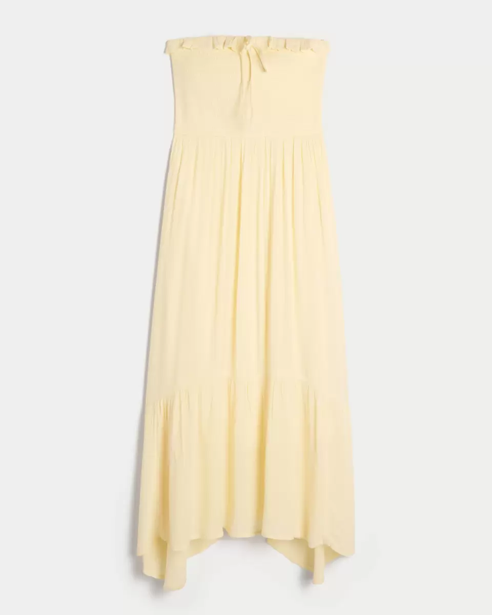 Flowy and super soft, this maxi-length dress features an asymmetrical hem and soft smocked bodice. Pretty ruffled neckline with center tie detail. Imported.