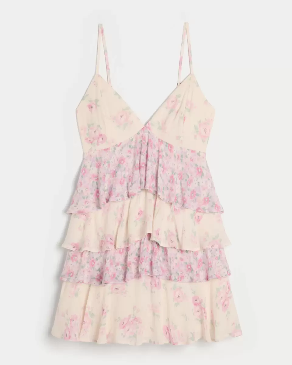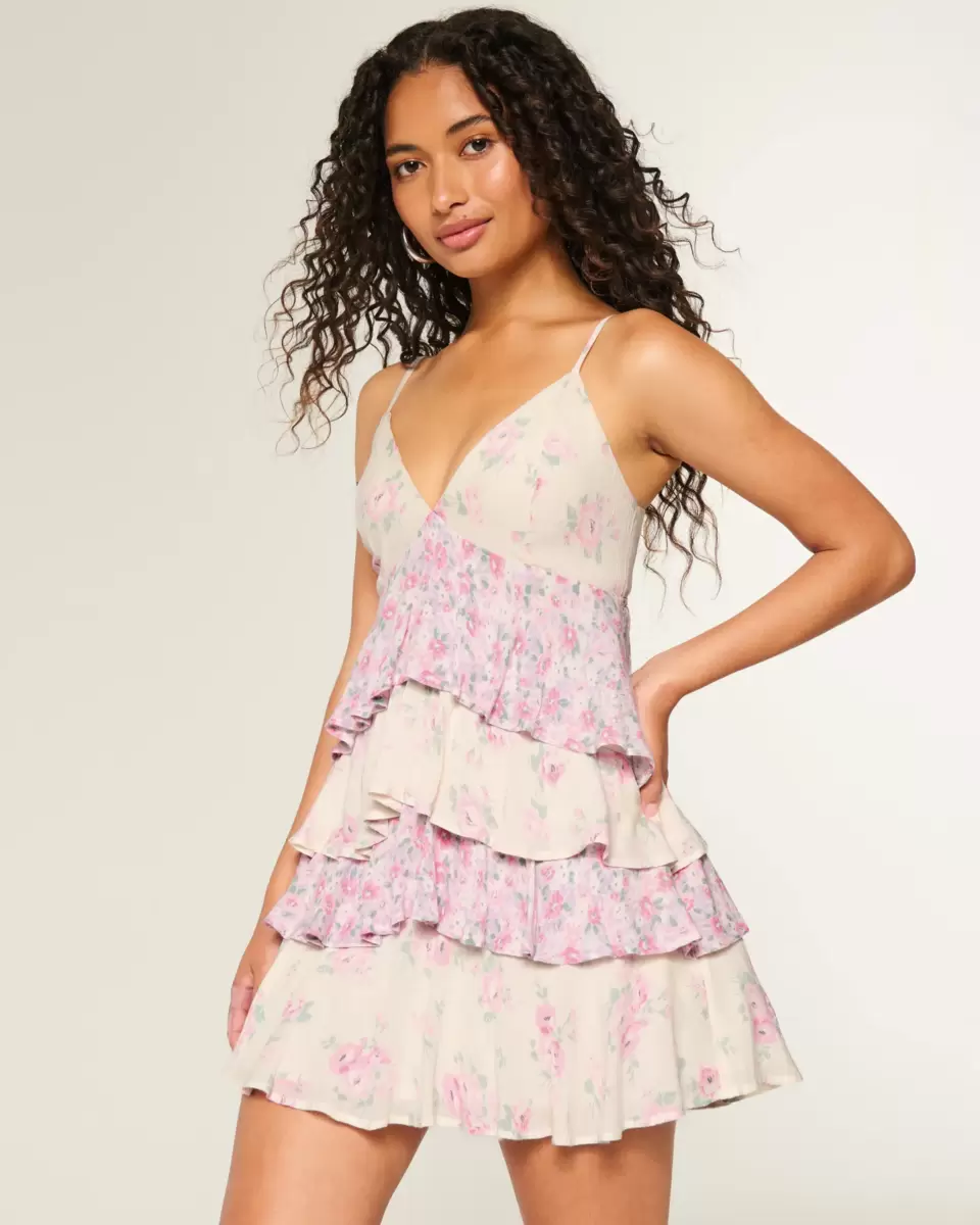Flowy and super soft, this mini dress features pretty ruffled tiers and a v-neckline. Back detail, removable pads, pockets. Imported.