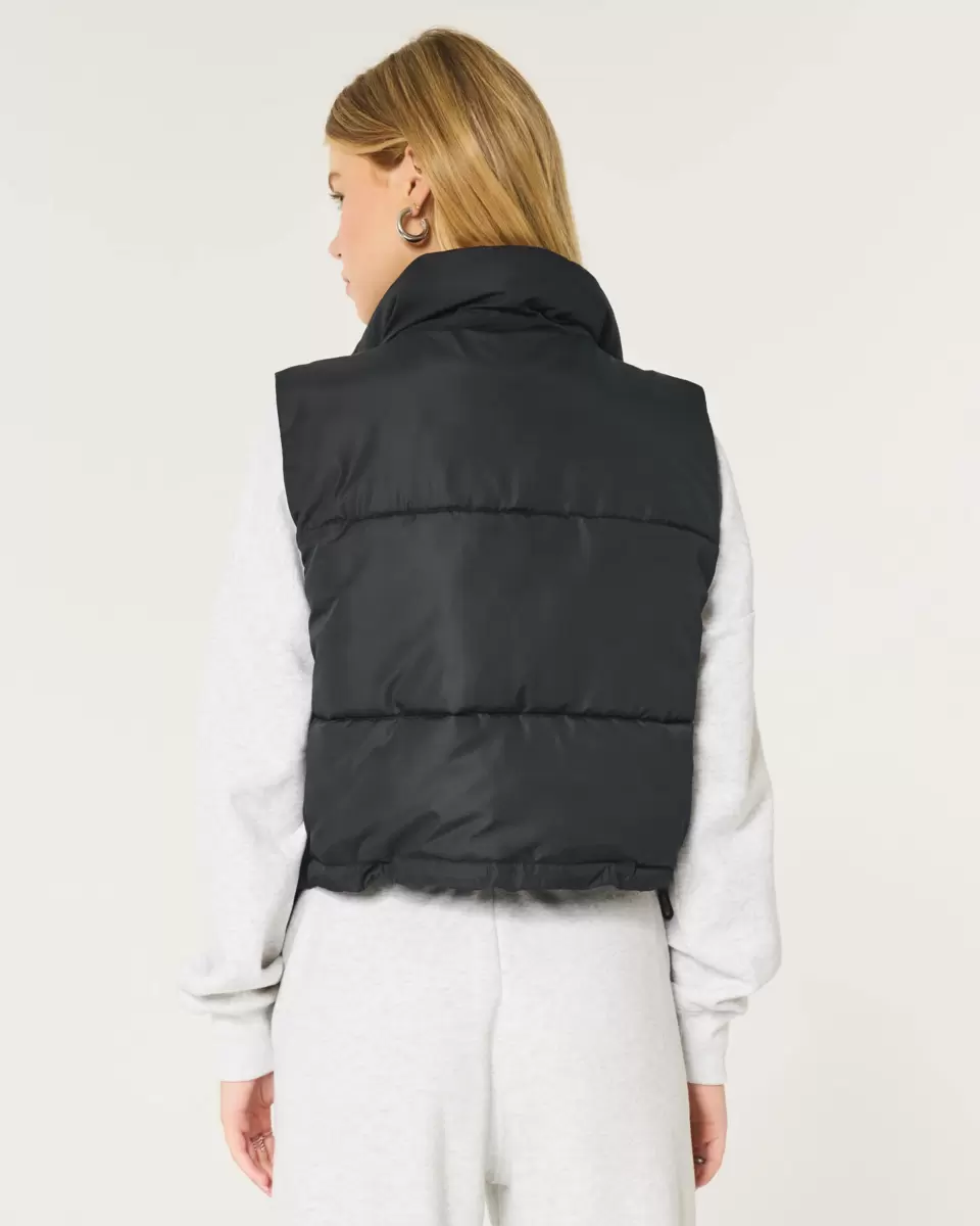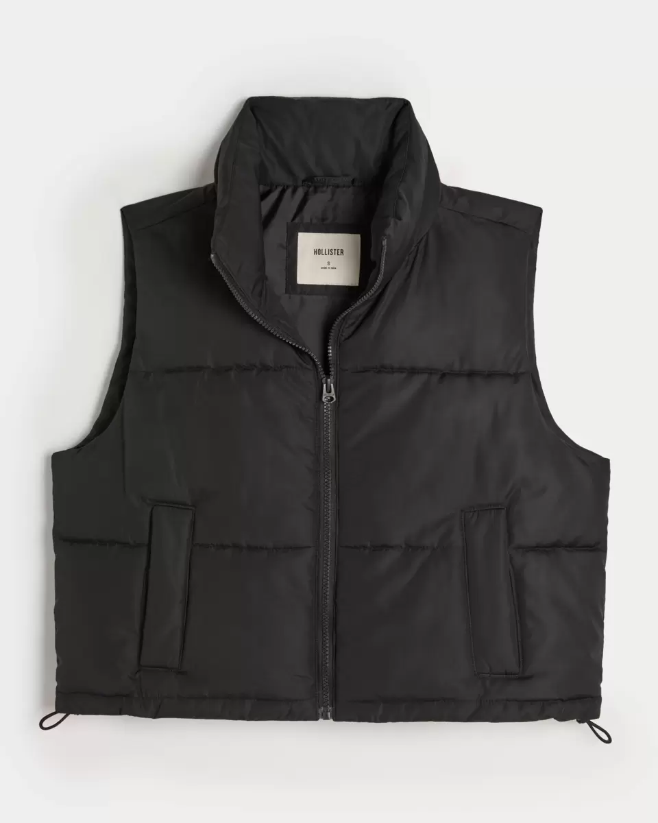 A cute and comfy mini puffer vest with a zip-up closure and mock-neck collar. Pockets, drawcord hem. Imported.