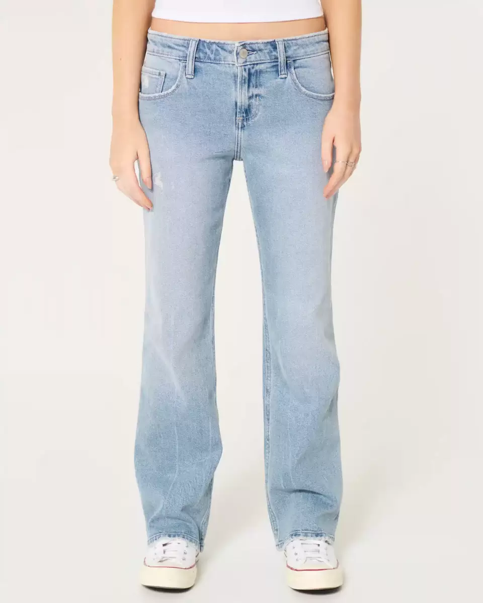 Classic jeans in a medium wash, designed with a relaxed straight leg and low-rise waist. Vintage Stretch denim with fading and distressed detailing. Imported.