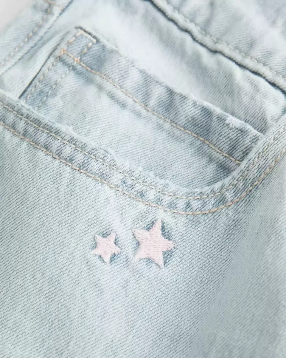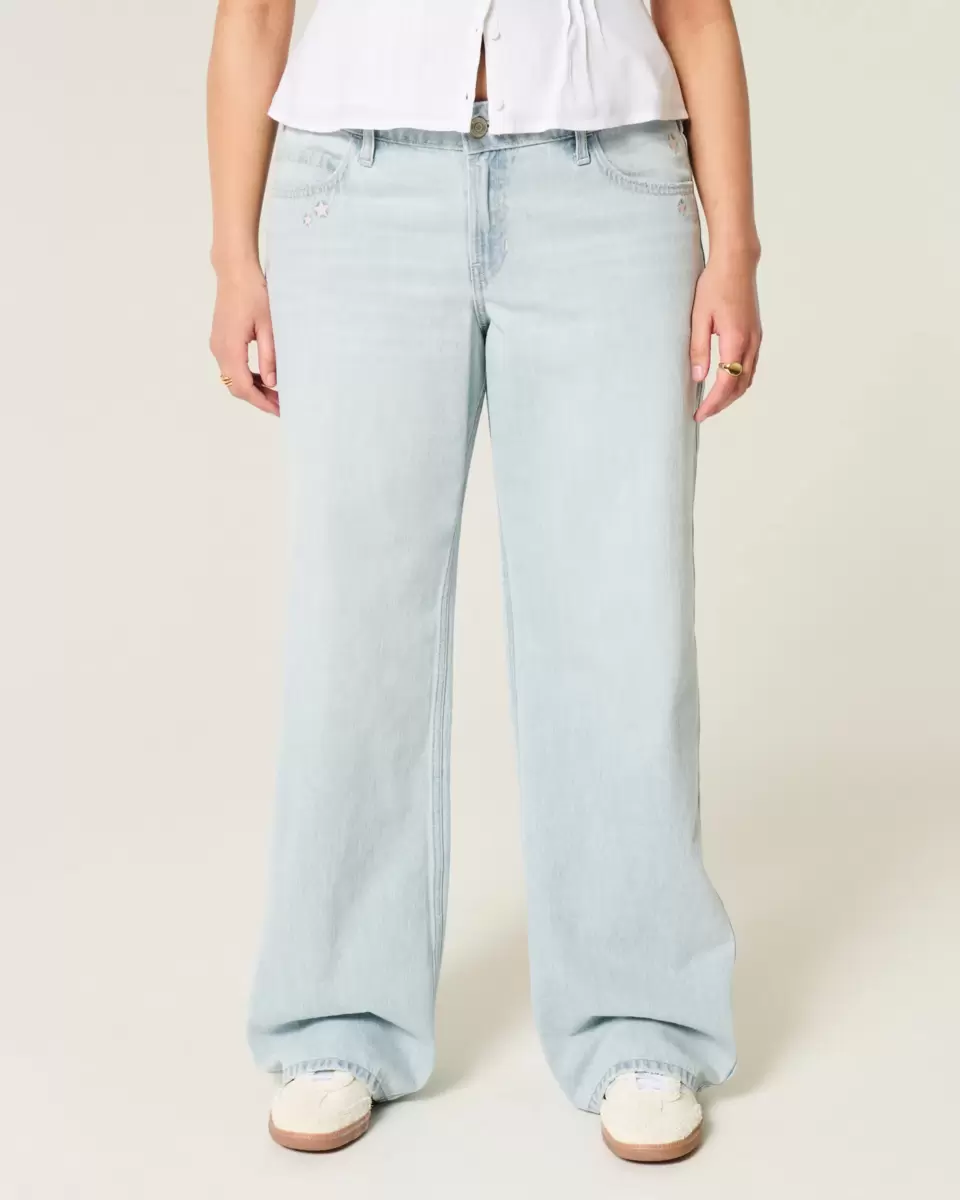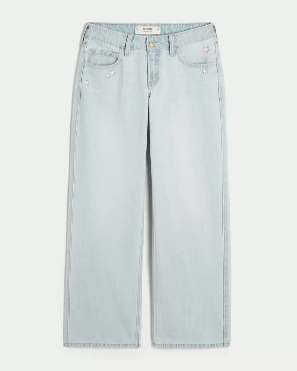 Comfortable denim jeans designed with a low-rise waist and baggy leg. Light wash, star embroidery, fading, whiskering. Imported.