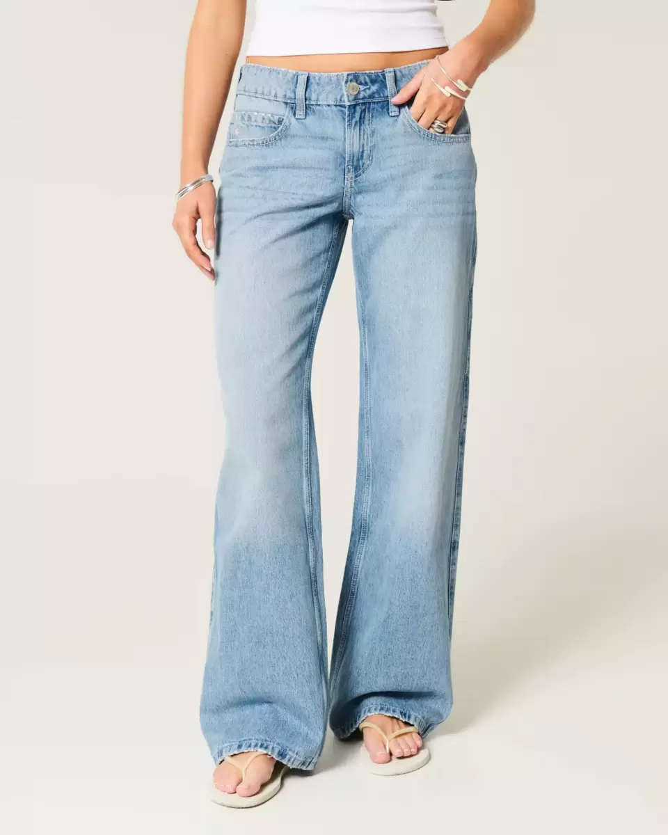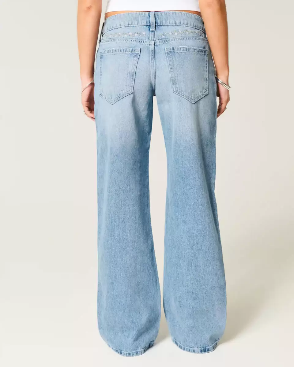 Comfortable denim jeans designed with a low-rise waist and baggy leg. Medium wash denim with fading and whiskering. Floral embroidery at the right coin pocket and back pocket. Imported.