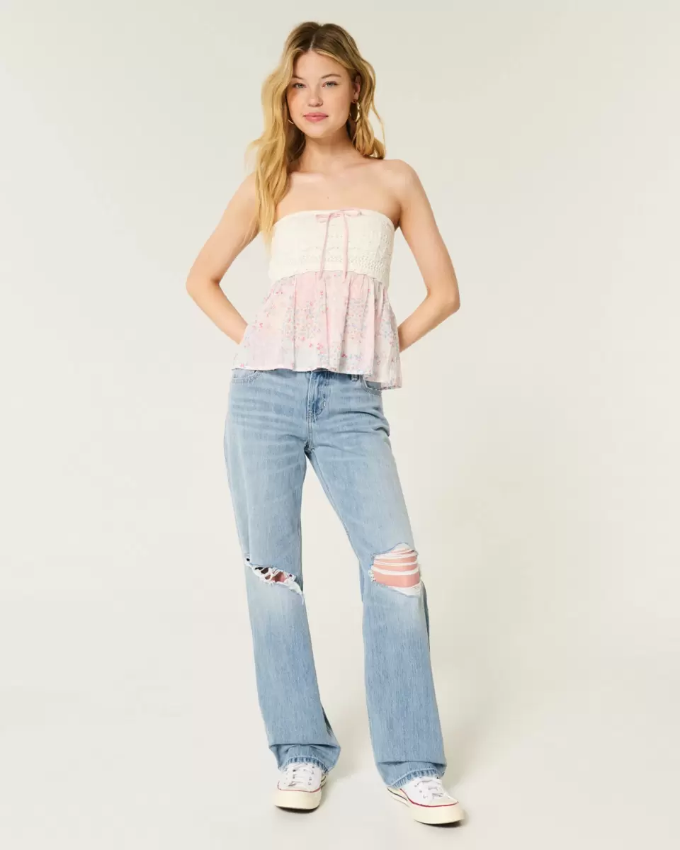 Cute and comfortable denim jeans in a light wash with ripped details, fading and whiskering. Loose leg, low-rise waist.