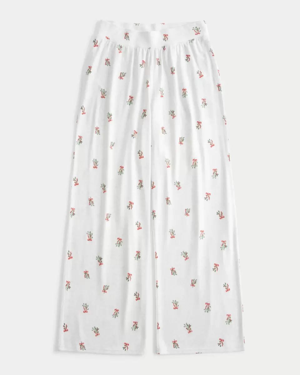 Super soft pajama pants with a banded waist and all-over mistletoe pattern. Wide-leg silhouette. Imported.