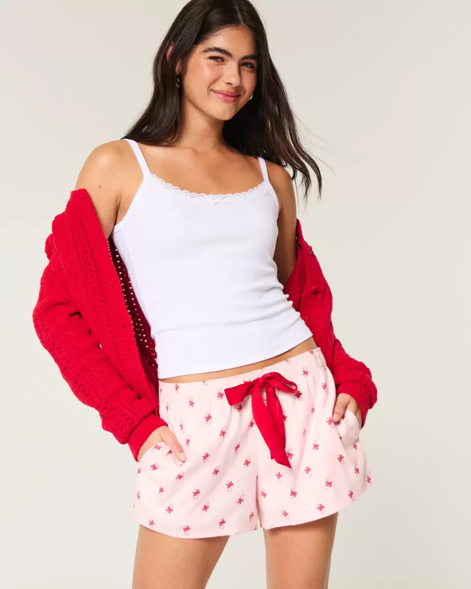 Super soft flannel sleep shorts with a tie waist and pockets. All-over holiday pattern. Imported.