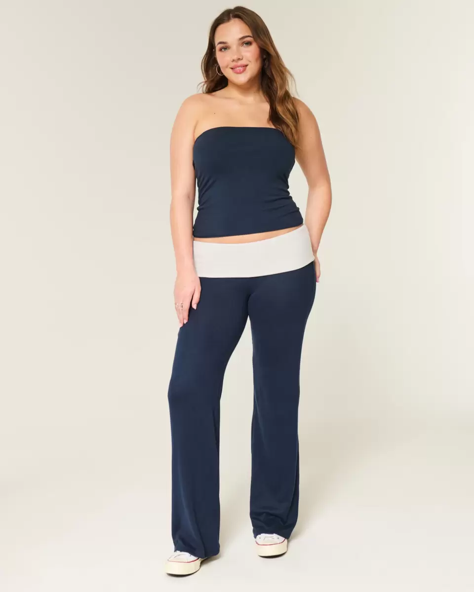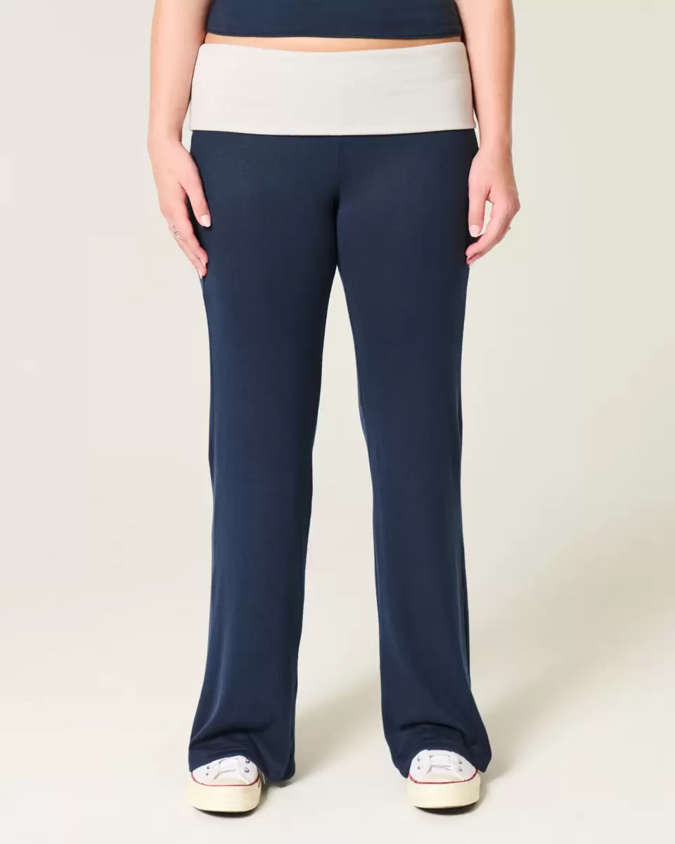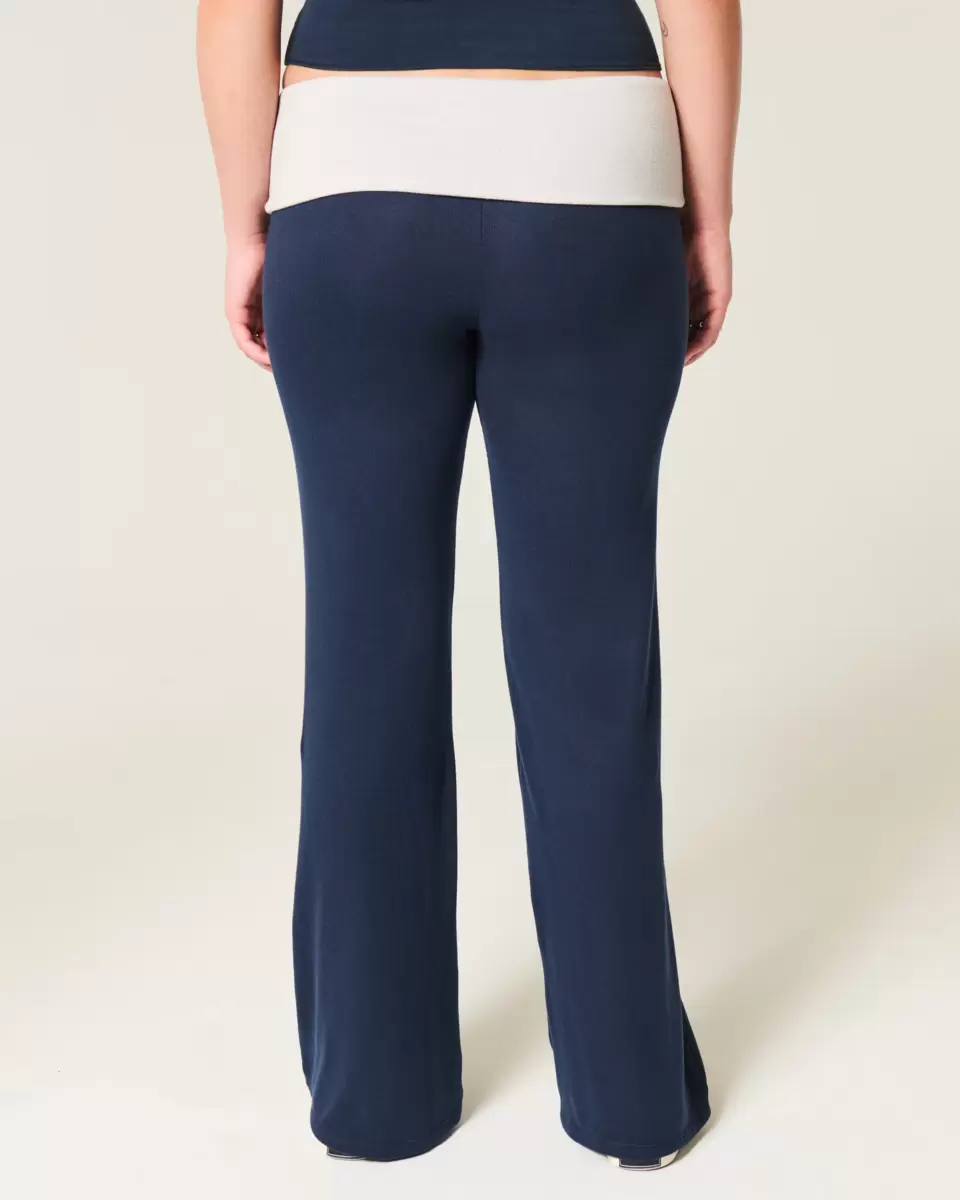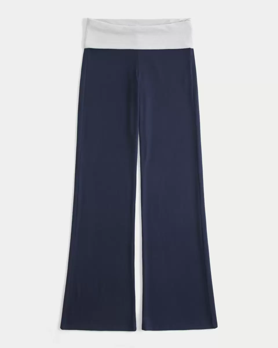 Cozy and super soft knit flare pants with a colorblock foldover waistband. Pockets, adjustable rise. Imported.